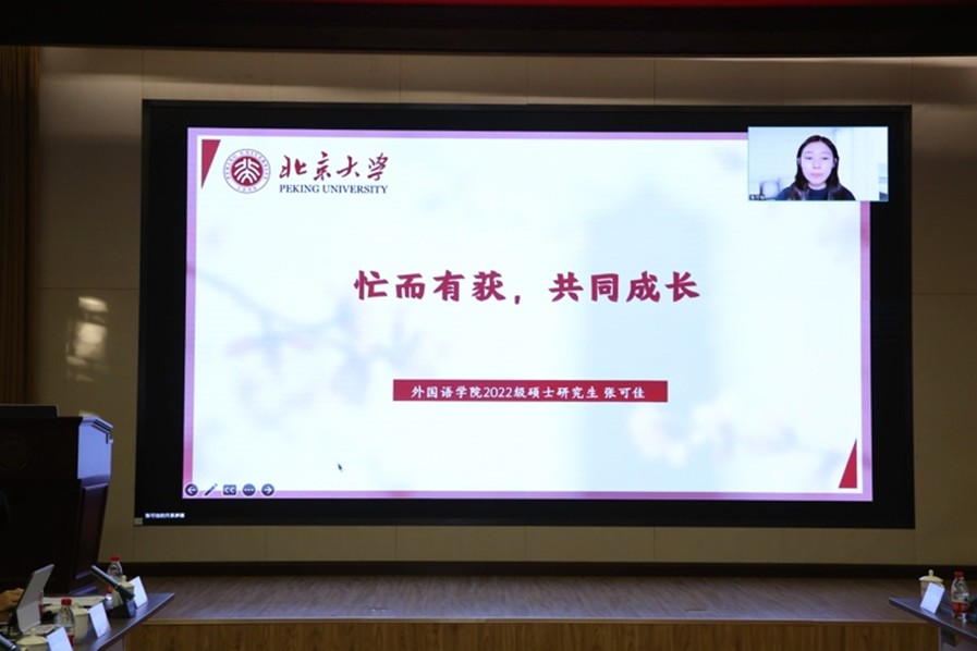 同学们从学术探索、海外交换、第二课堂等维度,分享了一年来的成长与收获。朱佳仪讲述了自己在语言学习、学术研究中的兴趣探索。在北大外院学习的两年里,她深刻感受到语言绝不仅仅是一种工具,在一步一个脚印的攀登中,她从语言洞见文化,从基础学习迈向学术训练,日益成长为一名优秀的外语学习者。