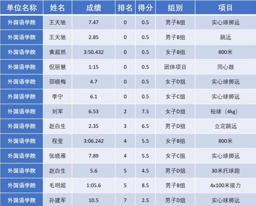在个人项目竞赛中,赵白生老师摘得男子D组立定跳远铜牌,获得男子D组30米托球跑第五名;刘军老师摘得女子D组铅球(4kg)银牌,张晓雁老师获得女子C组实心球掷远第四名,程莹老师在800米竞赛中获得了第四名优异成绩。