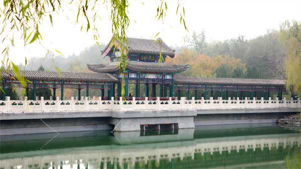 枫叶红火银杏黄,亭台楼阁径通幽。