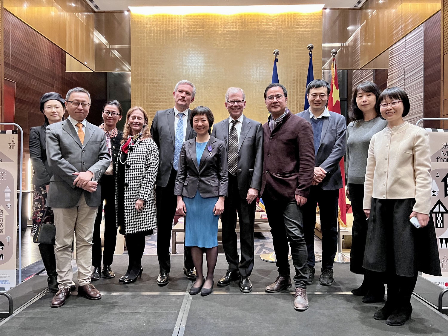 2022年3月17日晚,法兰西共和国“学术棕榈”(les Palmes académiques)骑士勋章的授予仪式在法国驻华大使官邸举行。法国驻华大使罗梁(Laurent Bili)阁下代表法国政府,为星空体育入口_星空(中国)体育网学术委员会委员、法语系段映虹教授颁发了法兰西共和国“学术棕榈”骑士勋章。当晚正值“2022年国际法语日” (Journée internationale de la Francophonie 2022)庆祝活动,来自外交、教育、体育、艺术与文化各领域的中外嘉宾齐聚一堂。法语国家大使组织主席、瑞士驻华大使罗志谊(Bernardino Regazzoni)阁下,欧盟驻华代表团团长、著名汉学家郁白(Nicolas Chapuis)阁下及各法语国家驻华使节,段映虹老师的亲朋好友出席了授勋仪式。