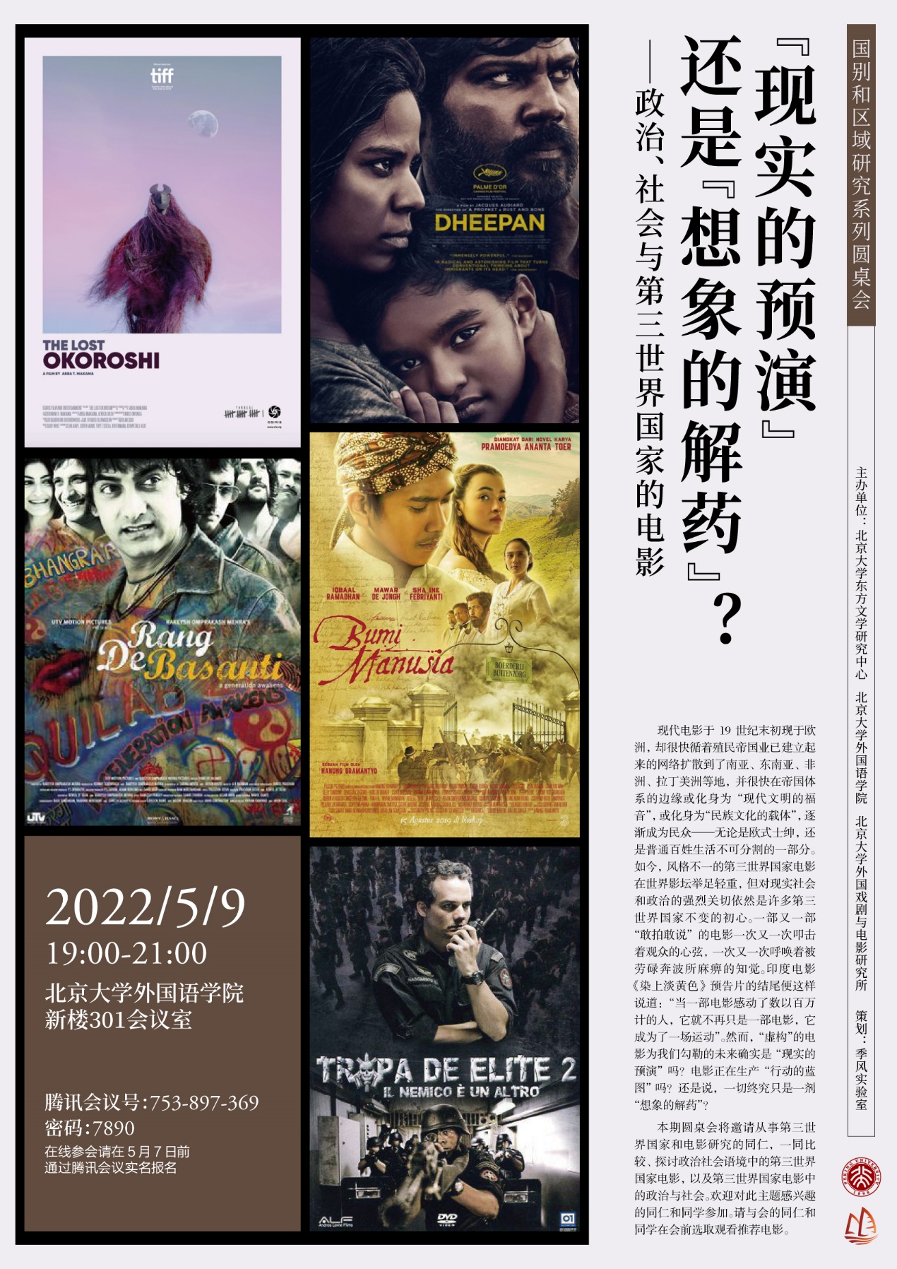 2022年5月9日晚,国别和区域研究圆桌会系列之“‘现实的预演’还是‘想象的解药’?——政治、社会与第三世界国家的电影圆桌会”在线上顺利举行。本次圆桌会由北京大学东方文学研究中心、星空体育入口_星空(中国)体育网、北京大学外国戏剧与电影研究所共同主办。本次圆桌会议邀请到星空体育入口_星空(中国)体育网法语系、西葡意语系、亚非系、东南亚系、国别和区域研究专业等系所学者出席,来自北京大学、清华大学、复旦大学、中国人民大学、北京外国语大学等高校院所的一百余名师生在线参与。