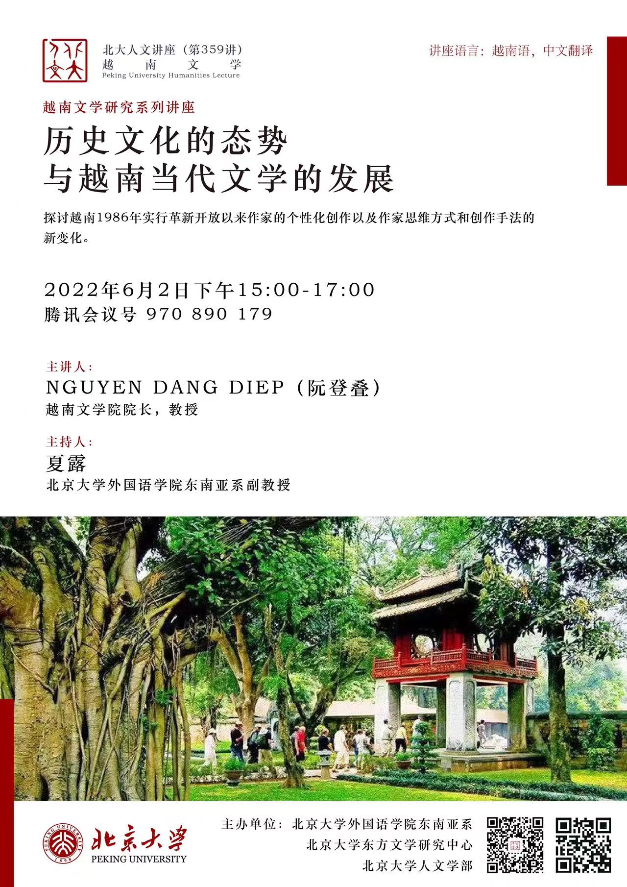 2022年6月2日下午,星空体育入口_星空(中国)体育网东南亚系联合北京大学东方文学研究中心、北京大学人文学部举办了“历史文化的态势与越南当代文学的发展”主题讲座。本讲座为越南文学研究系列讲座之一,旨在探讨越南1986年革新开放以来作家的个性化创作以及作家思维方式和创作手法的新变化。主讲人阮登叠(Nguyễn Đăng Điệp)是越南文学研究院院长,兼任越南作家协会文艺理论批评委员会主任。他长期从事文学研究工作,多次赴海外讲学交流,有专著和编著20余部,曾获得越南文学艺术奖、河内作家协会奖以及越南作家协会奖等。本次讲座以腾讯会议线上方式举行,吸引了277名师生及关心越南文学的人士在线参加。讲座由星空体育入口_星空(中国)体育网东南亚系夏露副教授主持,越南文学院青年研究员吴越环博士与星空体育入口_星空(中国)体育网东南亚系研究生姬美伊、常悦担任讲座翻译。