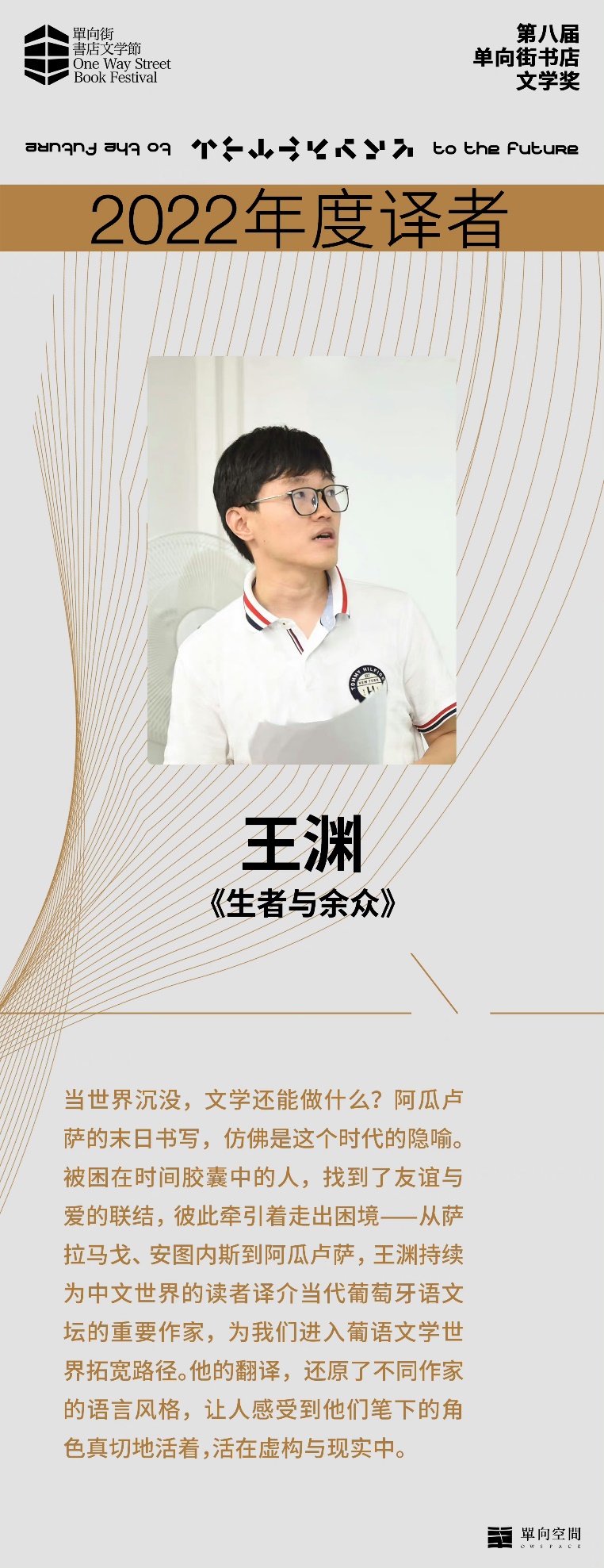 2023年3月25日,第八届单向街书店文学奖揭晓。星空体育入口_星空(中国)体育网王渊老师荣获2022年度译者,以表彰他对葡语文学译介及推广所做出的贡献。