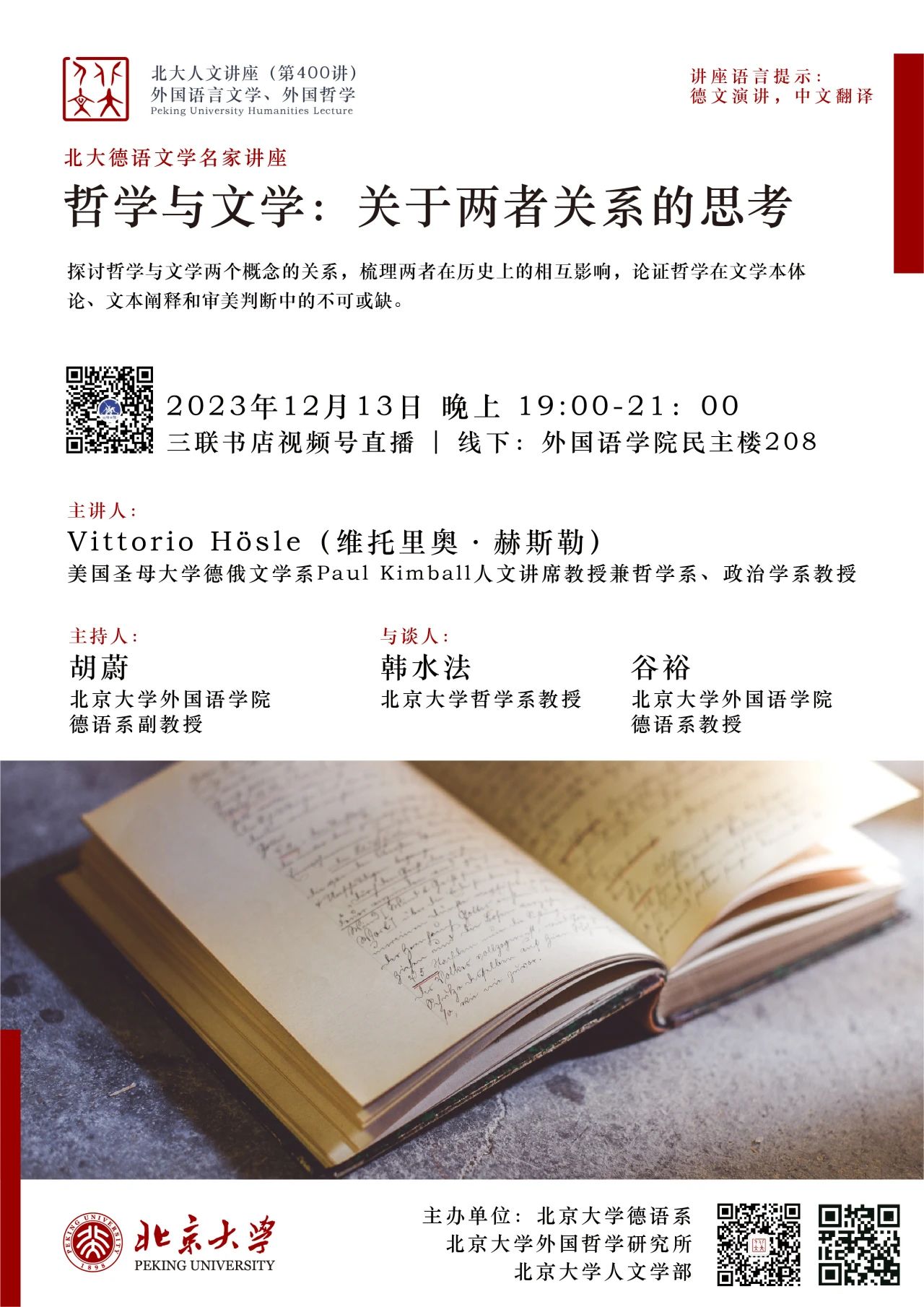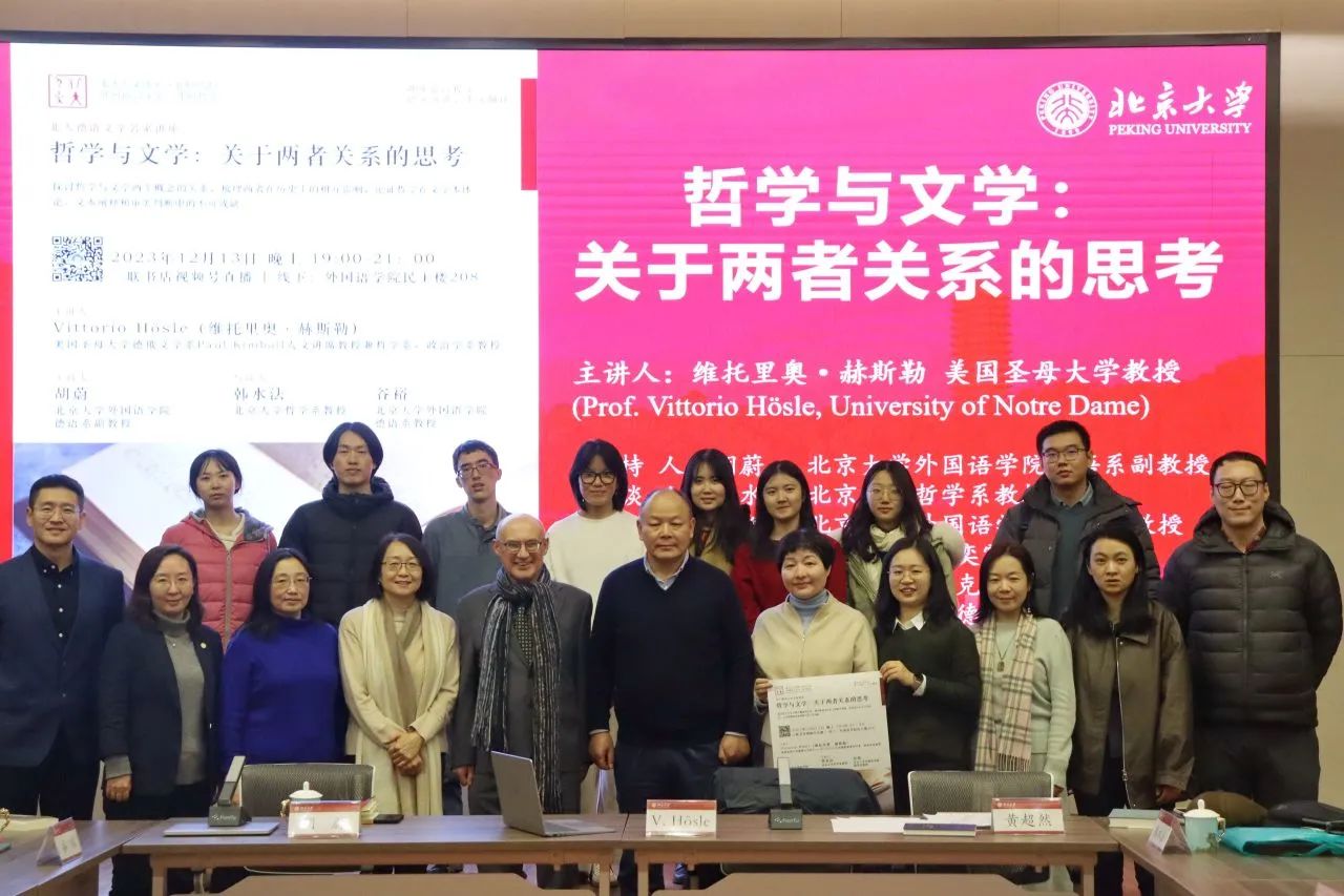 2023年12月13日晚,大雪纷飞,应星空体育入口_星空(中国)体育网德语系邀请,美国圣母大学Paul Kimball人文讲席教授(兼任德语系、哲学系、政治学系教授)、圣母大学人文高等研究院创始院长赫斯勒(Vittorio Hösle)教授在民主楼208会议室做题为“哲学与文学:关于两者关系的思考”的精彩主题报告。该讲座由星空体育入口_星空(中国)体育网德语系主任胡蔚副教授担任主持,哲学系韩水法教授、德语系谷裕教授担任与谈人,德语系黄超然助理教授担任现场交替传译。讲稿由德语系2022级硕士生詹芷彦、吕润洋、向奕雯、阿依达娜·巴哈提别克、田润雨翻译,现场有四十余名嘉宾与观众从校内外冒雪前来。本次活动由星空体育入口_星空(中国)体育网德语系、北京大学外国哲学研究所和北京大学人文学部联合主办,由三联书店视频号全程直播,共计有6700多人次收看。