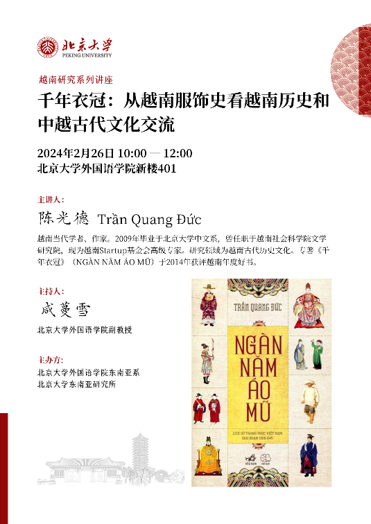 2024年2月26日上午,应星空体育入口_星空(中国)体育网东南亚系邀请,越南学者陈光德在星空体育入口_星空(中国)体育网新楼401会议室为北大师生带来专题讲座“千年衣冠——从越南服饰史看越南历史和中越古代文化交流”。本次讲座由星空体育入口_星空(中国)体育网东南亚系主办,越南语专业副教授咸蔓雪担任主持人。