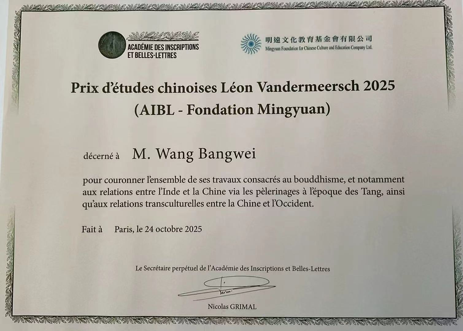 2025年10月24日晚,法兰西金石与美文学院在历史悠久、富丽堂皇的法兰西学院会议厅举行隆重的颁奖典礼,将“汪德迈中国学奖”(Le prix d’études chinoises en l’honneur de Léon Vandermeersch)授予学院南亚学系王邦维教授。金石与美文学院(l'Académie des Inscriptions et Belles-Lettres)院长傅飞岚(Franciscus Verellen)先生、终身秘书长尼古拉·格里马尔(Nicolas Grimal)先生、名誉终身秘书长米歇尔·冉克(Michel Zink)先生、法兰西艺术院终身秘书长洛朗·佩蒂吉尔巴尔(Laurent Petitgirard)先生、部分院士、中国驻法使馆文化处官员、法国和中国学者出席典礼。典礼上终身秘书长尼古拉·格里马尔先生宣读授予王邦维教授的决定并详细介绍王邦维个人的学术经历。王邦维教授在致谢发言中感谢法兰西学院授予其汪德迈中国学奖,回顾其学术研究受导师季羡林先生的指导,亦得益于同安德烈·巴罗(André Bareau)、汪德迈(Léon Vandermeersch)等学者的交流,深受沙畹(Éd. Chavannes)、伯希和(Paul Pelliot)、列维(Sylvain Lévi)等法国学者著作的启发。