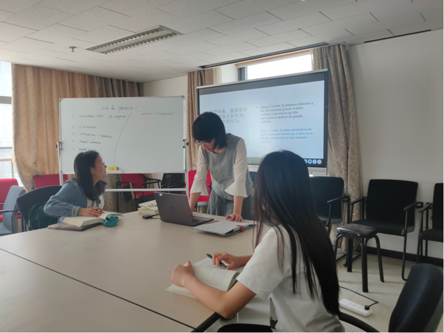 在法语读书会上,赵婉雪选取了《在实现中国梦的生动实践中放飞青春梦想》与同学们一同共读。活动中,她首先与同学们回顾了五四青年节期间开展的各项活动,并观看了视频《习近平总书记对新时代青年提出六点要求》。随后,她与同学们一道朗读了选读文章,分享了读书心得,并畅谈了各自的青春梦想。同学们在心中牢记着“一代更比一代强”的青春责任,在交流中碰撞出闪亮的生命火花。