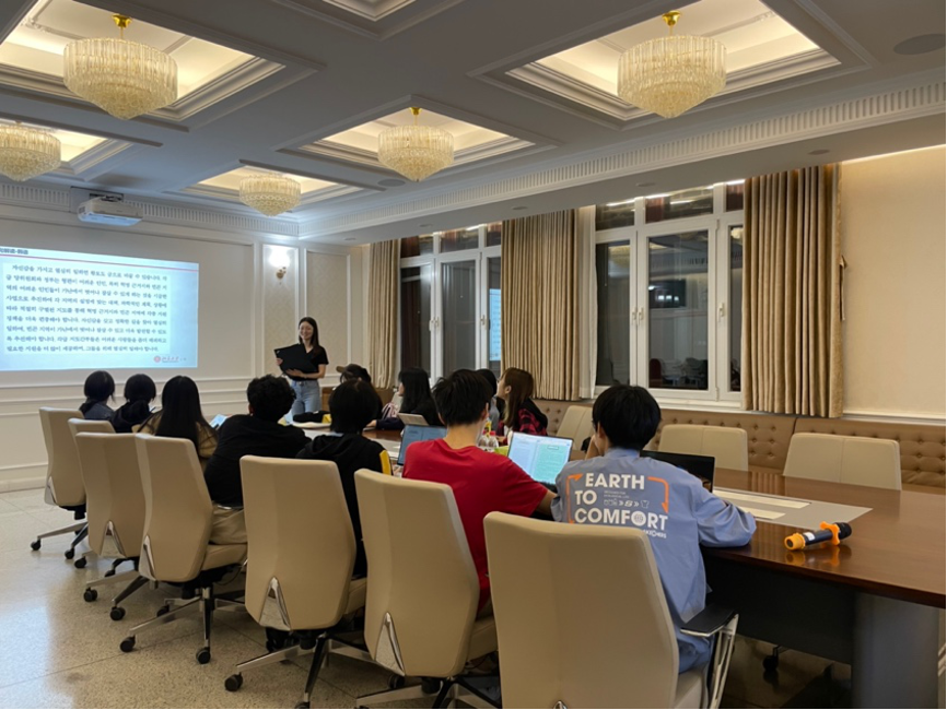 在朝韩语的读书会上,领读人孙启选择了《推动贫困地区脱贫致富、加快发展》一文作为他们的共读篇目。他首先讲解了“消除贫困”、“共同富裕”等词汇的韩语表达,通过词语深入解析现实境况与政策概念,帮助同学们进一步理解了中国共产党脱贫攻坚的理念。随后,她带领学生们就这一主题进行探讨交流,并鼓励学生们在今后的学习中深入了解脱贫攻坚与乡村振兴,在祖国和人民最需要的地方建功立业。