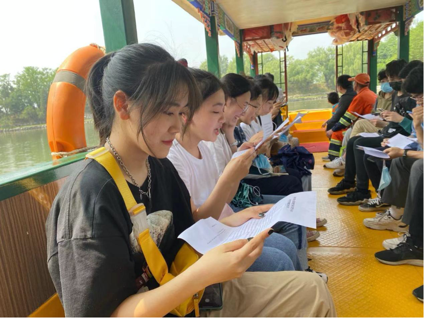 结束了西洋楼遗址的参观后,支部的同学们来到了圆明园湖上的游船中听取卢心然同学精心准备的党课。本次党课以“觉醒一代与我们这一代”为主体,在回忆觉醒年代的奋斗青年们的峥嵘岁月的同时,大家坐在圆明园的“红船”中,身临其境地感受到了党的一大在南湖红船上召开之时的历史氛围。支部成员们在追忆历史的同时,又在卢心然同学的带领下提出了我们作为新一代北大青年、中国青年的历史使命和任务:作为一名外院的学子,我们要不懈努力,在深层次地了解世界各国人民与文化的同时,在多个领域与世界各国进行更高层次上的交流。