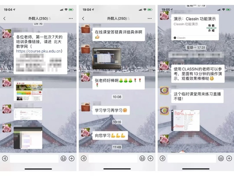 学院组织全体教师积极参与教发中心组织的系列培训,通过外院邮件群和“外院人”微信群广泛宣传,提醒老师按时参加培训,帮助老师加入各种技术服务群。同时通过“外院人”微信群向老师们分享各种平台使用技巧、操作方法等技术文档。老师们热情高涨。博雅讲席教授段晴老师、申丹老师带头学习、参加培训,并在“外院人”微信群中与大家积极互动,极大的激励了全院教师学习各种网络教学平台的热情,老师们互相帮助,很好的掌握了各类网络授课技能。