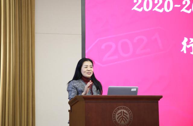 张冬梅老师首先肯定了行政团队2020-2021学年的工作。经过不懈的努力,行政团队在校内各部门的评优、评选中获得了可喜的成绩,疫情防控工作也得到了学校、学院领导和教师的高度肯定。张冬梅老师以财务办公室提供无等侯报销服务为例,希望各部门简化、优化办事流程,为自己做加法,为师生做减法。鼓励大家继续努力,以问题为导向,建立大局意识,在紧张中保持镇定,在繁忙中保持从容,做职业化的行政人员。