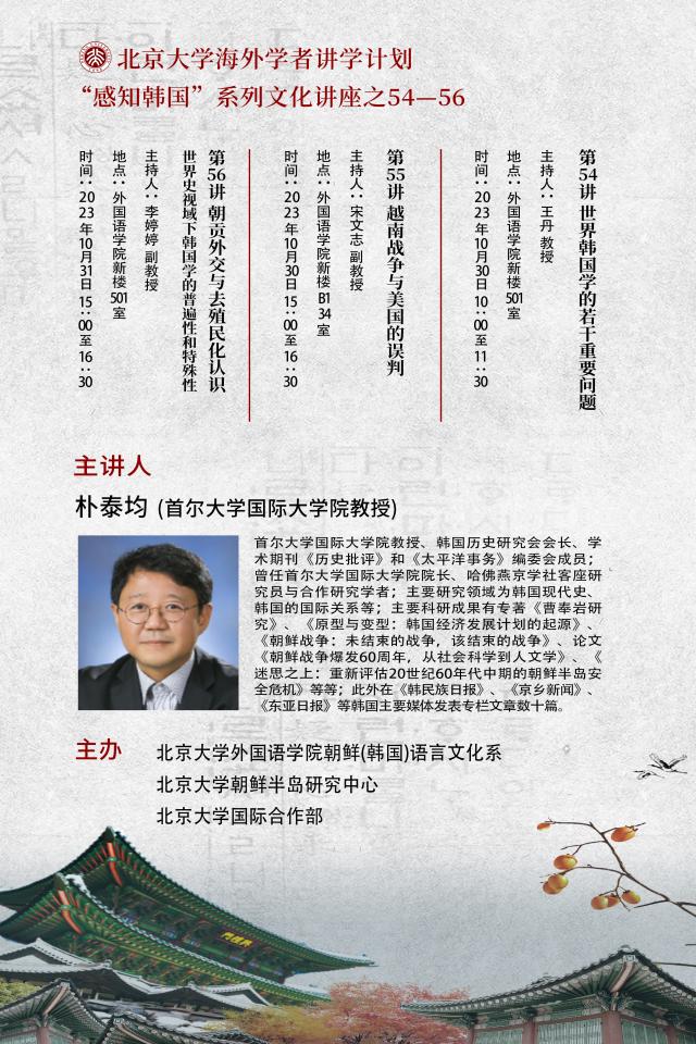 2023年10月30日至31日,受“北京大学海外学者讲学计划”支持,由星空体育入口_星空(中国)体育网朝鲜(韩国)语言文化系、北京大学朝鲜半岛研究中心、北京大学国际合作部共同主办的“感知韩国”系列讲座第五十四至五十六讲在外院新楼成功举办。三场讲座主题分别为“世界韩国学的若干重要问题”“越南战争与美国的误判”“朝贡外交与去殖民化认识——世界史视域下韩国学的普遍性和特殊性”,主讲人为韩国首尔大学国际大学院朴泰均教授,由星空体育入口_星空(中国)体育网副院长王丹教授、朝(韩)语系宋文志副教授、系主任李婷婷副教授主持,朝(韩)语系全体教师出席,全系各年级同学也积极参与了讲座。