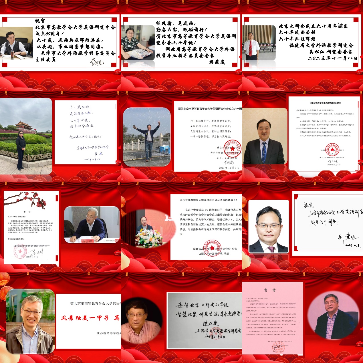 在天津、吉林、陕西、河北、湖北、内蒙古、山西、江苏、上海、重庆、广东、福建等12个兄弟省市大学英语教学研究会会长的热情洋溢的视频贺词后,与会领导与嘉宾们一起观看了北京市高等教育学会大学英语研究分会60周年的影像回顾,在唤起的回忆中共同见证一路走来的累累硕果。