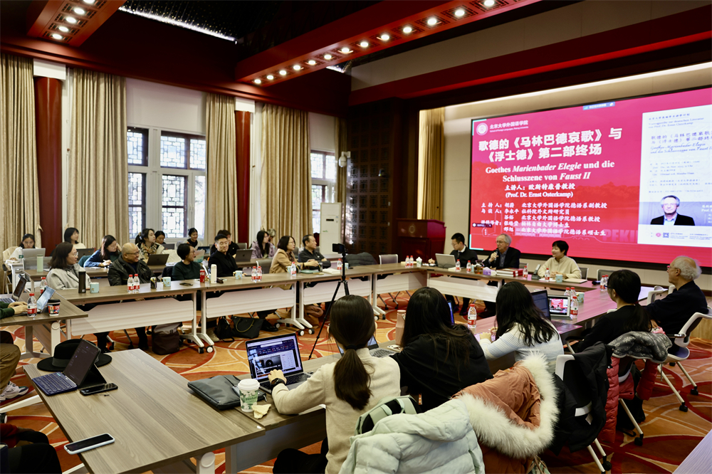 11月16日,第二场讲座“歌德的《马林巴德哀歌》与《浮士德》第二部终场”于星空体育入口_星空(中国)体育网民主楼208会议室举行。本场讲座由北京大学德语系主任胡蔚副教授主持,社科院外文所李永平研究员、北京大学德语系谷裕教授与谈。欧斯特康普教授从《马林巴德哀歌》与《浮士德》第二部最末“山涧”一场戏的成文史出发,通过细致的文本分析,开创性地揭示了这两部作品之间以“爱”之主题构建的内在观念。欧斯特康教授的分析从作者的生平与文本的创作入手,将文本外部的社会历史背景与文本内部的思想内涵及艺术表达综合起来,扩展了文本的阐释空间,并结合手稿清晰地展示了语文学研究从文本出发、见微知著的基本路径。
