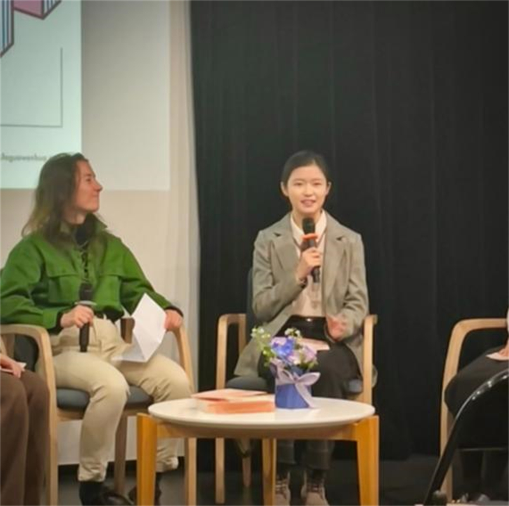 本届龚古尔文学奖中国评选的获奖作品是让·巴蒂斯特·安德里亚(Jean-Baptiste Andrea)的小说《守护她》( Veiller sur elle ),该作品也赢得了2023年法国龚古尔奖。上海颁奖礼结束后,北京分会场举行了现场圆桌讨论,北京大学、北京外国语大学与北京语言大学的三位学生代表分享了各自评选小组的参评过程与心得体会。法语系20级李嘉文同学代表北大小组参加圆桌讨论,她以清晰、流畅、优美的法语赢得了现场观众的赞誉。