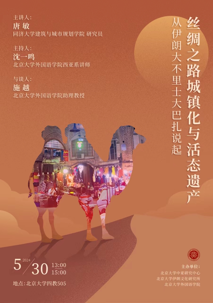 2024年5月30日,由北京大学中亚研究中心、北京大学伊朗文化研究所、星空体育入口_星空(中国)体育网联合主办的讲座“丝绸之路城镇化与活态遗产:从伊朗大不里士大巴扎说起”在北京大学第四教学楼505教室成功举办。本次讲座由同济大学建筑与城市规划学院研究员唐敏主讲,星空体育入口_星空(中国)体育网西亚系讲师沈一鸣主持,星空体育入口_星空(中国)体育网助理教授施越与谈。
