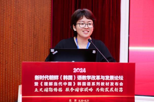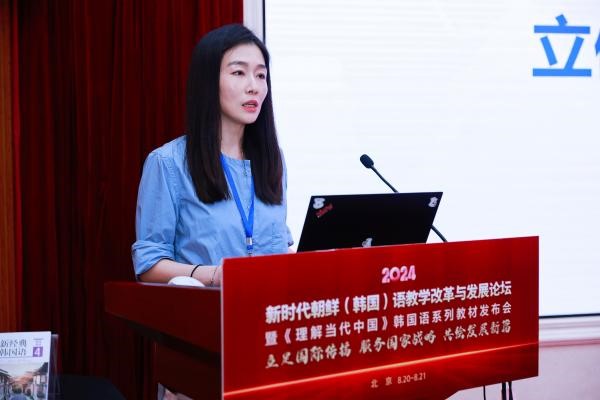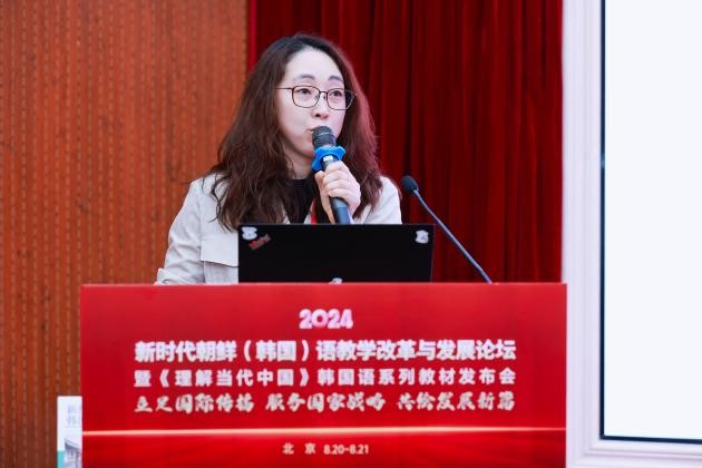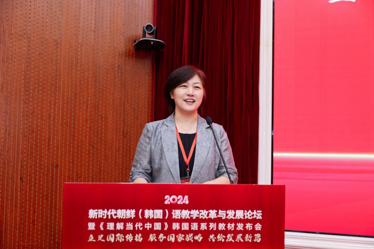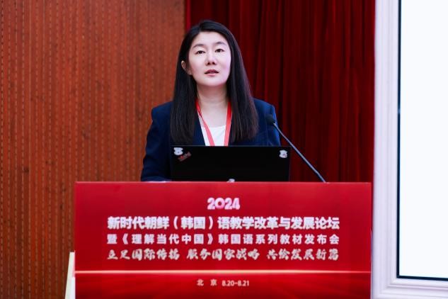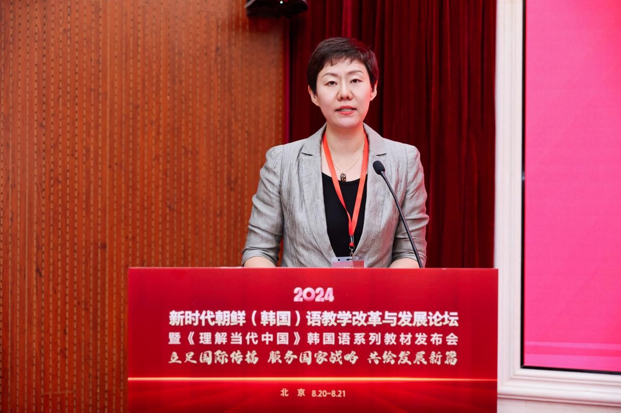 常小玲副总编辑代表外研社对莅临本次论坛的各位领导、专家和老师表示欢迎,对一直以来支持《理解当代中国》系列教材编写、出版和使用的外文局专家和高校专家表示感谢,同时也向韩国语系列教材编写团队表示祝贺。《理解当代中国》系列教材作为为国家培养国际传播人才的战略性工程和引领新时代我国外语教育发展的创新之作,对所有外语教师是一次思想和理念的洗礼。外研社将继续携手专家和教师团队,为推动朝鲜语专业改革创新不懈努力,为培养更多高水平国际化人才贡献力量,真正对接国家战略需求,将二十届三中全会强调的“构建更有效力的国际传播体系”落到实处。