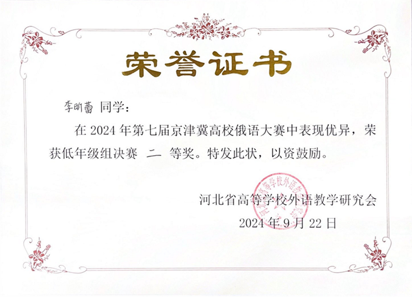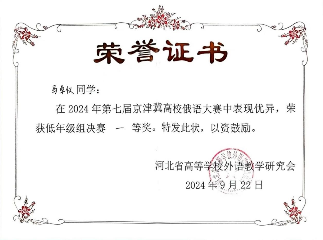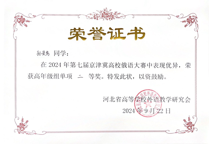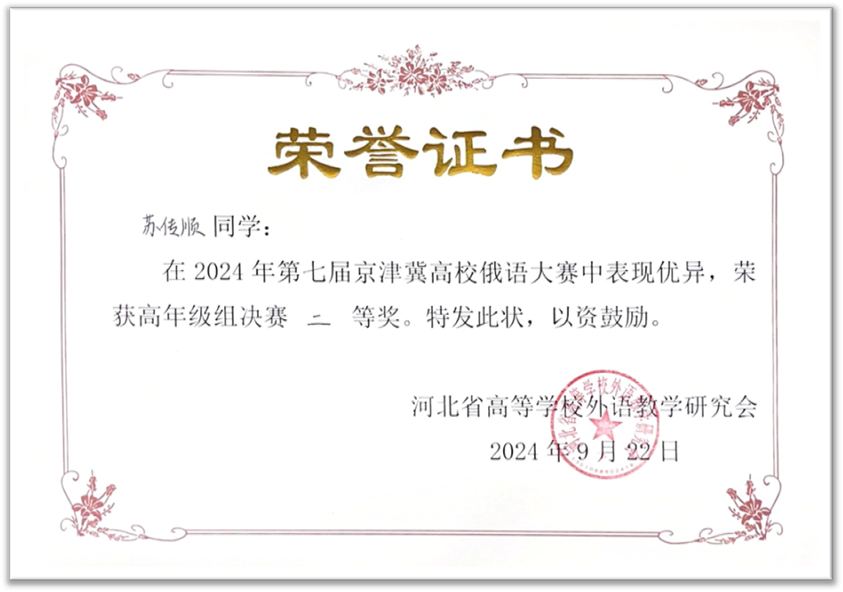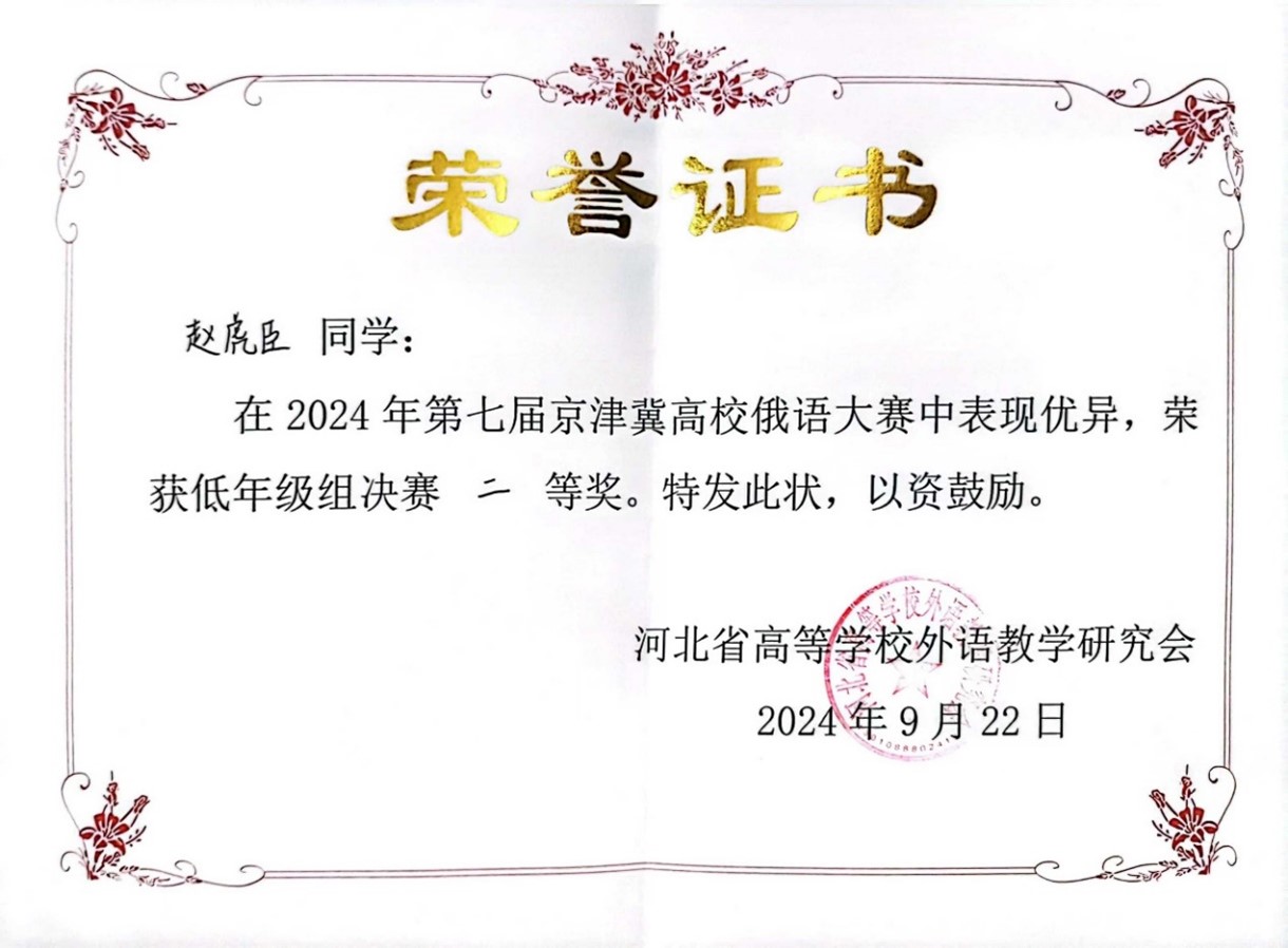 2024年9月21日至22日,由河北省高等学校外语教学研究会主办,河北师范大学星空体育入口_星空(中国)体育网承办的第七届京津冀高校俄语大赛顺利举办。北京大学俄语系本科生苏传顺(2021级)、孙灵秀(2022级)、王若溪(2022级)以及李昕蕾(2023级)、马卓仪(2023级)、赵虎臣(2023级)分别参加了高年级与低年级两个组别的比赛,由陈松岩担任带队老师,在黄颖老师、尹旭老师与外教叶莲娜·瓦列里耶芙娜(Елена Валерьевна)等俄语系教师的精心辅导下,俄语系所有参赛选手均取得了优异成绩。马卓仪获一等奖,李昕蕾、苏传顺、赵虎臣获二等奖,孙灵秀获演讲单项二等奖,王若溪获演讲单项三等奖。