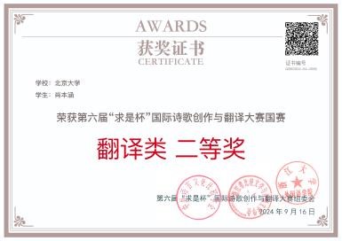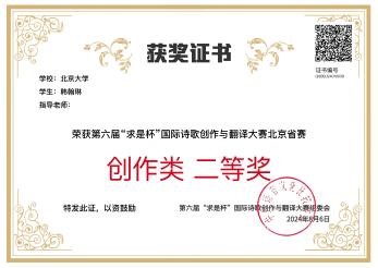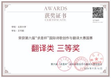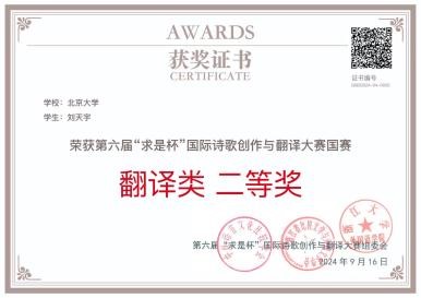俄语系学生不仅在翻译比赛中取得了优异成绩,还积极参与“求是杯”诗歌创作比赛。韩翰琳(2022级本科生)、肖本涵获北京赛区创作类二等奖,乔莹(2022级硕士生)获三等奖。