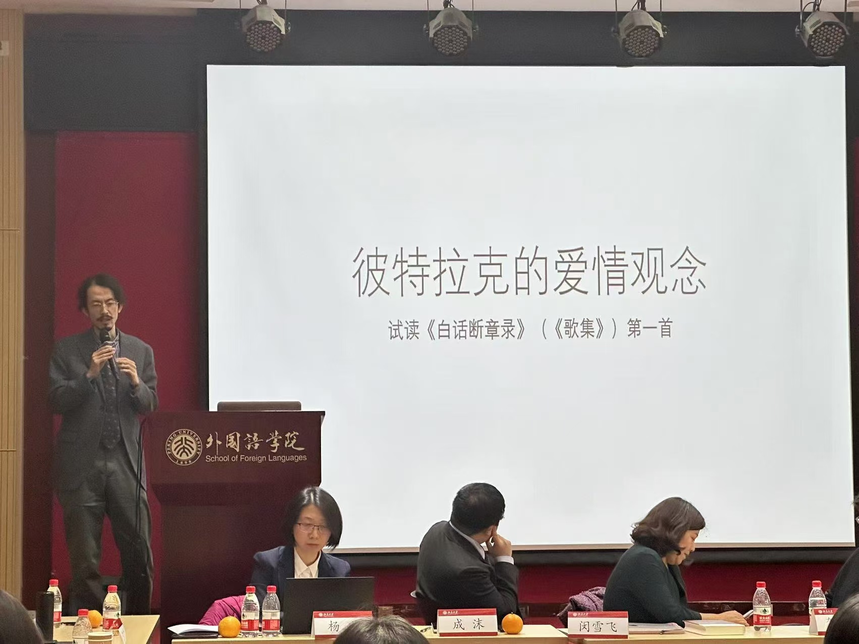 北京大学中文系教授、中国比较文学学会会长张辉和北京大学哲学系教授、北京大学元培学院院长李猛做特邀报告。张辉以《乡愁与超越乡愁:荷尔德林、奥尔巴赫与塔可夫斯基的片段》为题作报告。他从荷尔德林的诗篇出发,借海德格尔之阐释,融合雨果的“三种境界”与塔可夫斯基电影《乡愁》的片段,深刻剖析了“乡愁”在现代世界与文学研究中的丰富内涵,勉励师生以世界为异乡,追寻文化本源,通过外国文学研究探寻最本真的自我。李猛则以《激情的理性:现代哲学的一个隐秘章节,以及为什么文学不是哲学》为题,从辛格著作谈起,梳理了人类对激情理解的演变历程,从柏拉图到笛卡尔,再到斯宾诺莎、休谟,展现了哲学与文学在构建世界理解上的不同路径。他强调,哲学构建理想而往往缺失自我,文学则以真实丰盈现实,在理解世界的层面上形成对照。