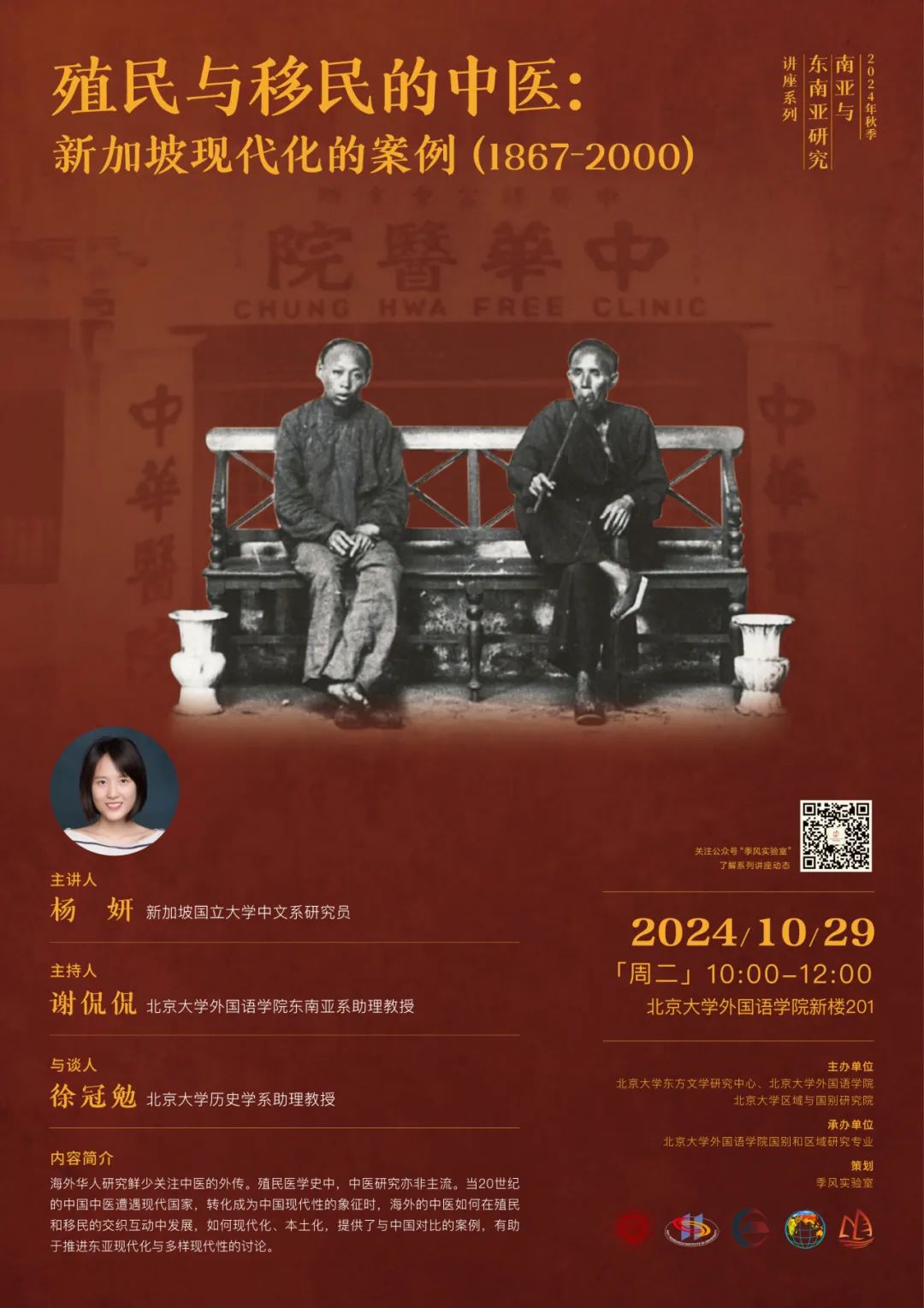 2024年10月29日,新加坡国立大学中文系研究员杨妍老师应邀为我院师生进行学术讲座,题为“殖民与移民的中医:新加坡现代化的案例(1867-2000)”。本讲座由北京大学东方文学研究中心、星空体育入口_星空(中国)体育网,及区域与国别研究院主办,星空体育入口_星空(中国)体育网院长陈明教授、历史学系助理教授徐冠勉出席讲座并参与对谈。