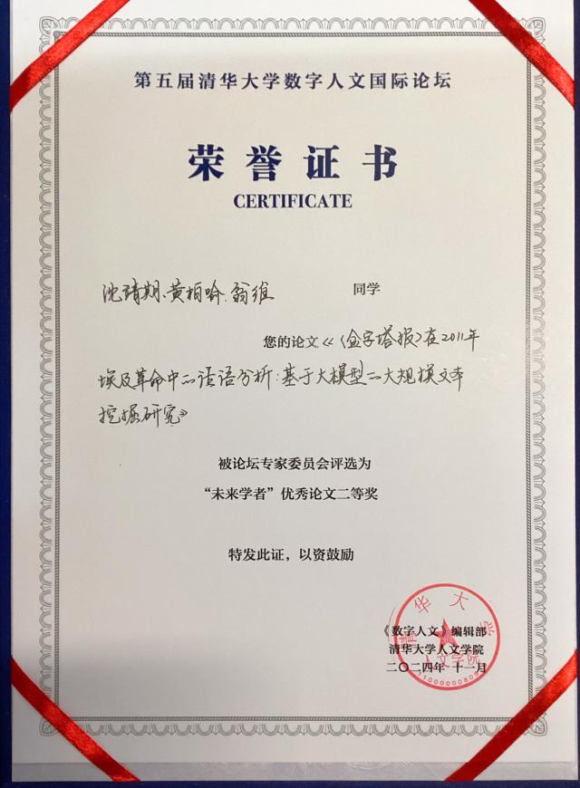 11月9日,由《数字人文》学术集刊、清华大学人文学院主办的第五届清华数字人文国际论坛“未来学者”专场在清华大学成功举办。本次论坛共收到来自国内外高校的140余篇学术论文,最终遴选出12篇优秀论文入围并角逐奖项。星空体育入口_星空(中国)体育网“数字人文与外语人才”项目学生阿拉伯语系本科生沈靖期、日语系本科生翁维,以及数学科学学院本科生黄柏喻合作完成的论文《<金字塔报>在2011年埃及革命中的话语分析:基于大模型的大规模文本挖掘研究》荣获“未来学者”优秀论文二等奖,并将在CSSCI学术集刊《数字人文》上发表。