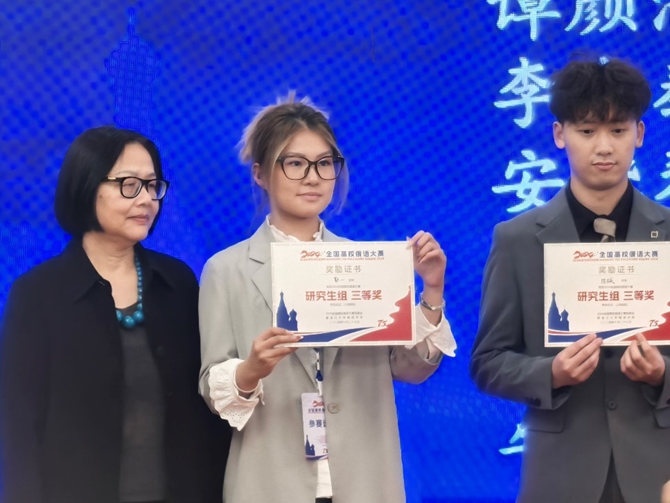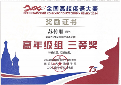 2024年10月26日至27日,第十七届全国高校俄语大赛的复赛与决赛在哈尔滨市伏尔加庄园举行。本次大赛由教育部国际合作与交流司主办,黑龙江大学承办。星空体育入口_星空(中国)体育网俄语系本科生马卓仪(2023级)、苏传顺(2021级)与硕士研究生郭一(2023级)参加此次 比赛。马卓仪获低年级组二等奖,苏传顺获高年级组三等奖,郭一获研究生组三等奖。