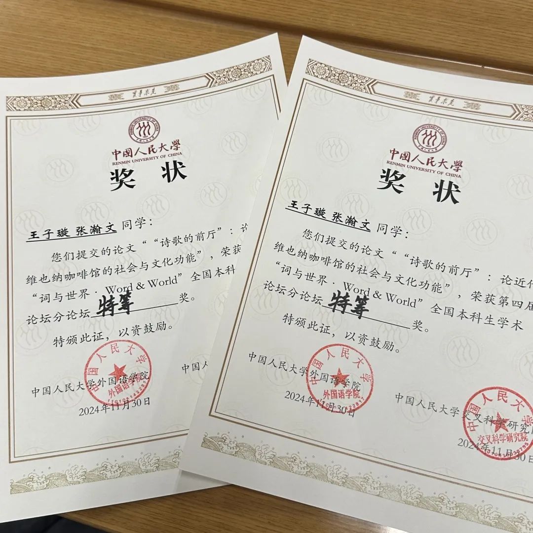2024年11月30日,由中国人民大学星空体育入口_星空(中国)体育网、交叉科学研究院主办的第四届“词与世界”全国本科生学术论坛顺利落幕。本届论坛以“外国语言文学与跨学科创新”为主题,涵盖英语、法语、德语、日语、俄语、西班牙语六个语种,面向全国高校本科生征稿。星空体育入口_星空(中国)体育网德语系2023级本科生王子璇、张瀚文在德语系林琳老师的指导下,完成了以《‘诗歌的前厅’:论近代维也纳咖啡馆的社会与文化功能》为题的研究,在论坛宣读报告,最终荣获分论坛特等奖的殊荣。