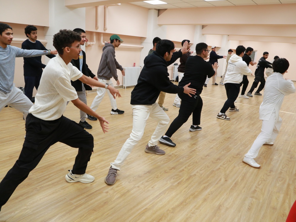 座谈部分结束后,代表团同学们与阿拉伯语系师生共同移步外文楼三层的活动教室,他们在此与太极、乒乓球老师进行短暂的交流学习,亲身感受中国的传统国粹和现代国粹运动。男同学们来到了太极教室。北京大学体教部王东敏副教授首先介绍了太极的基本动作,让大家对中国传统国粹武术有了基本的了解。接着,教授带领同学们亲自体验了太极动作,切身感受其中传承千年的中国智慧,开拓了体育运动的新视野。