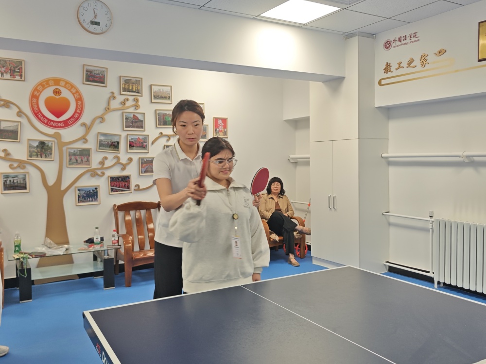 代表团中的女同学们则来到了乒乓球教室。北京交通大学体育部张华庆老师先为大家系统讲授了握拍姿势,并为大家轮流喂球,让每位同学在实践中体验正确的接球和发力方式。在代表团同学的积极要求下,老师安排大家进行双打和单打比赛,激烈的对战让大家真正体验到了乒乓球运动的魅力。讲解部分结束后,男同学们也来到了乒乓球教室,他们表达了对乒乓球运动的浓厚兴趣。几位有过专业运动基础的同学们主动向教练发起友谊赛邀约,中阿友谊在乒乓球的一声声清脆碰撞中得到了升华。