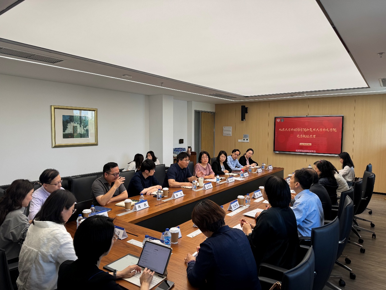 在复旦大学外国语言文学学院,院长高永伟、党委书记薛海霞对北大外院调研组的到来表示热烈欢迎,并详细介绍了该院在教师队伍建设、科研项目申报等方面的具体举措,着重阐述了人工智能赋能人才培养的创新实践以及构建学术共同体的相关经验。随后,双方相关领域负责领导展开深入交流讨论,就学科建设中的共性问题与特色发展路径交换意见。会后,调研组参观复旦外院文化建设成果空中花园,俯瞰复旦大学文化新地标——“复旦源”。