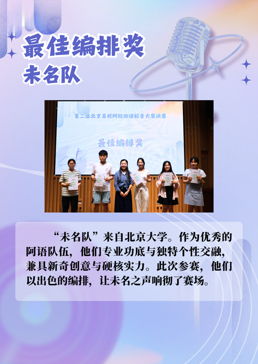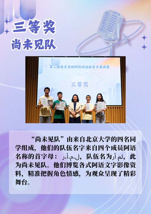 比赛分为自选片段和固定片段配音两个环节,来自五所高校的10支代表队同台竞技。北京大学派出“尚未见队”与“未名队”两支新生代表队参赛,由阿拉伯语系2024级10名本科新生组成,博士后孔雀老师担任赛事评委。