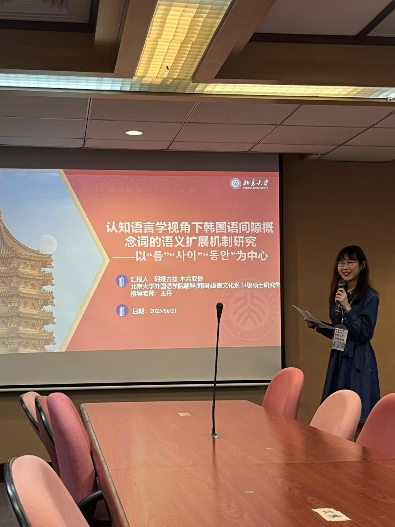 开幕式后,论坛进入发言讨论环节,来自五校的11名研究生宣读论文,参会同学进行了热烈讨论与深入交流,参会老师们进行点评与指导。王丹老师主持第二场主题发言,我院朝(韩)语系王恩泽同学、阿娅古兹·木合亚提同学先后以《塑造“华界”:中国近代在朝华商租界制度的构想与实践》、《认知语言学视角下韩国语间隙概念词的语义拓展机制研究——以“틈”,“사이”,“동안”为中心》为题发言。