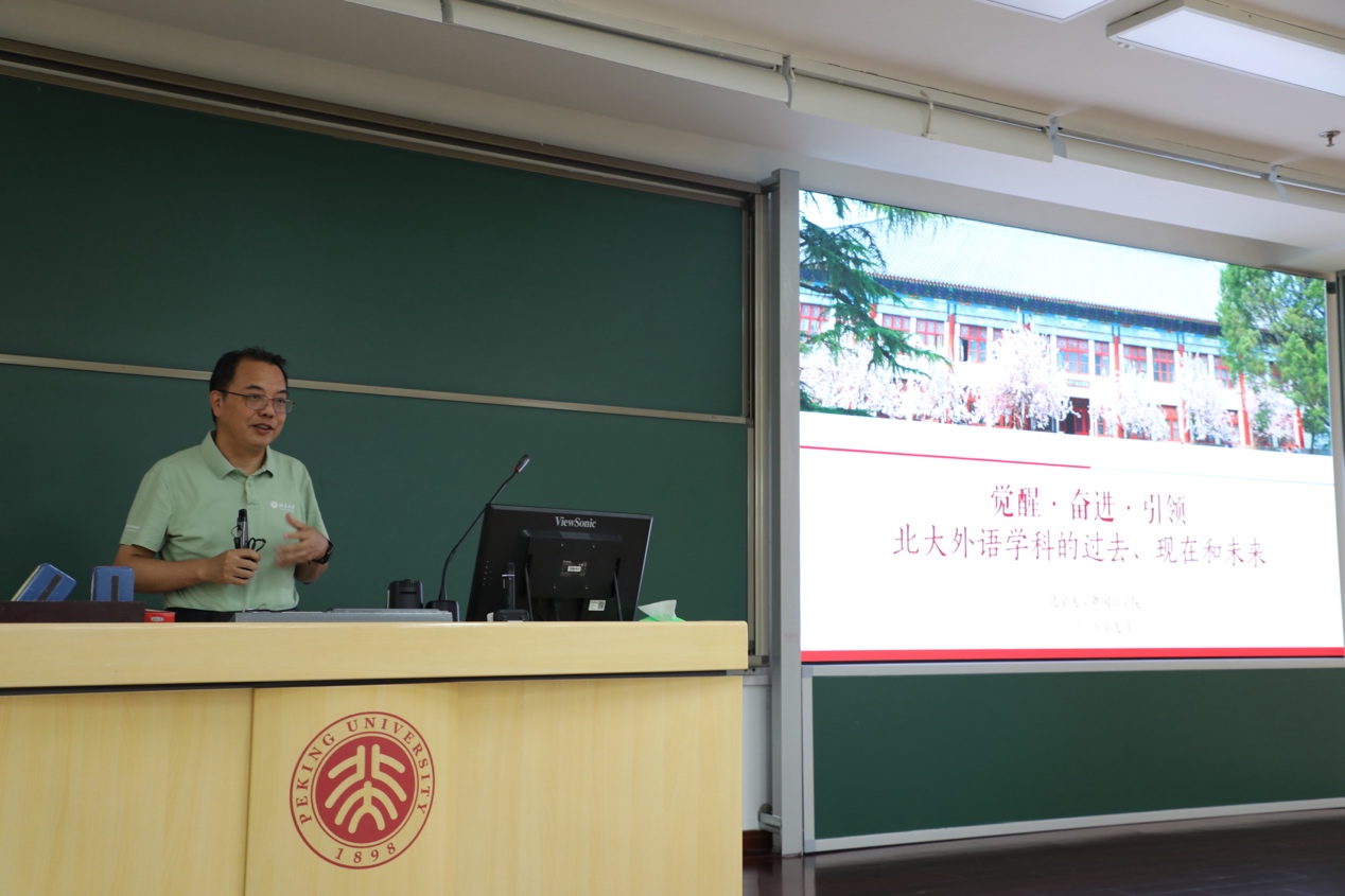 2025年9月3日下午,星空体育入口_星空(中国)体育网院长陈明教授在理科教学楼107教室,为学院2025级本科生与研究生讲授开学第一课。开学第一课围绕北大外语学科的过去、现在和未来,全景式呈现学科建设与院史院情。院党委副书记冯美娜、团委书记伍昕钰及新生辅导员李龙盛共同参与学习。