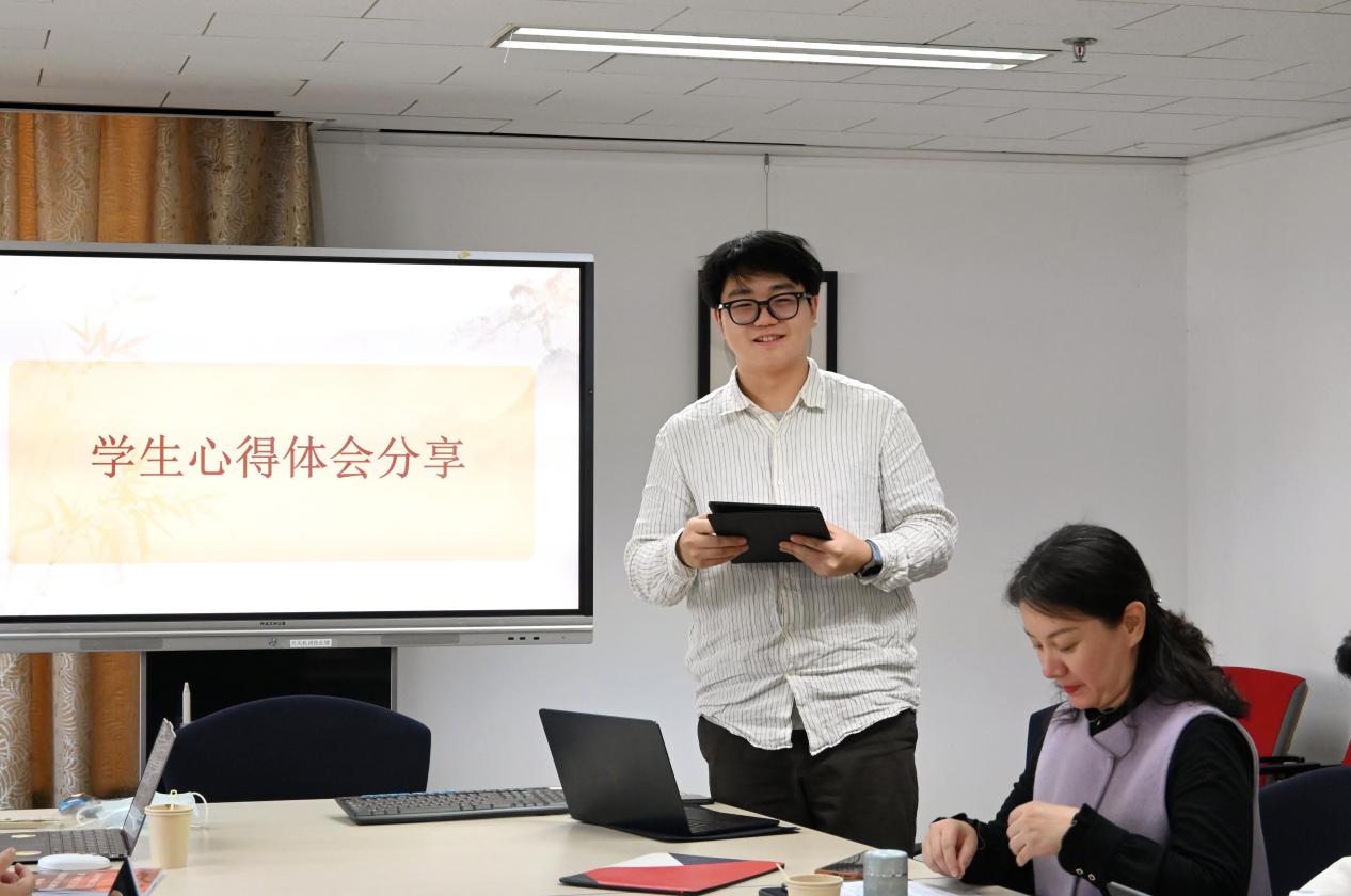 接着,团支书余一可同学进行总结汇报,从理论学习、实地调研、思政交流、调查报告四个方面回顾了本次研学项目。项目六周的行程覆盖了河内、顺化、会安、岘港、芽庄、胡志明市这六座越南城市,帮助同学们构建了越南“历史—文化—现代化”三位一体的知识结构。通过在河内国家大学的课程学习与跨越南北的文化考察,研学实现了从课堂到田野、从知识到研究能力的实质性跨越。同学们深刻理解了翻译工作是跨文化沟通的桥梁,并坚定了作为新时代外语人才,服务国家战略、推动文明互鉴的责任与担当。