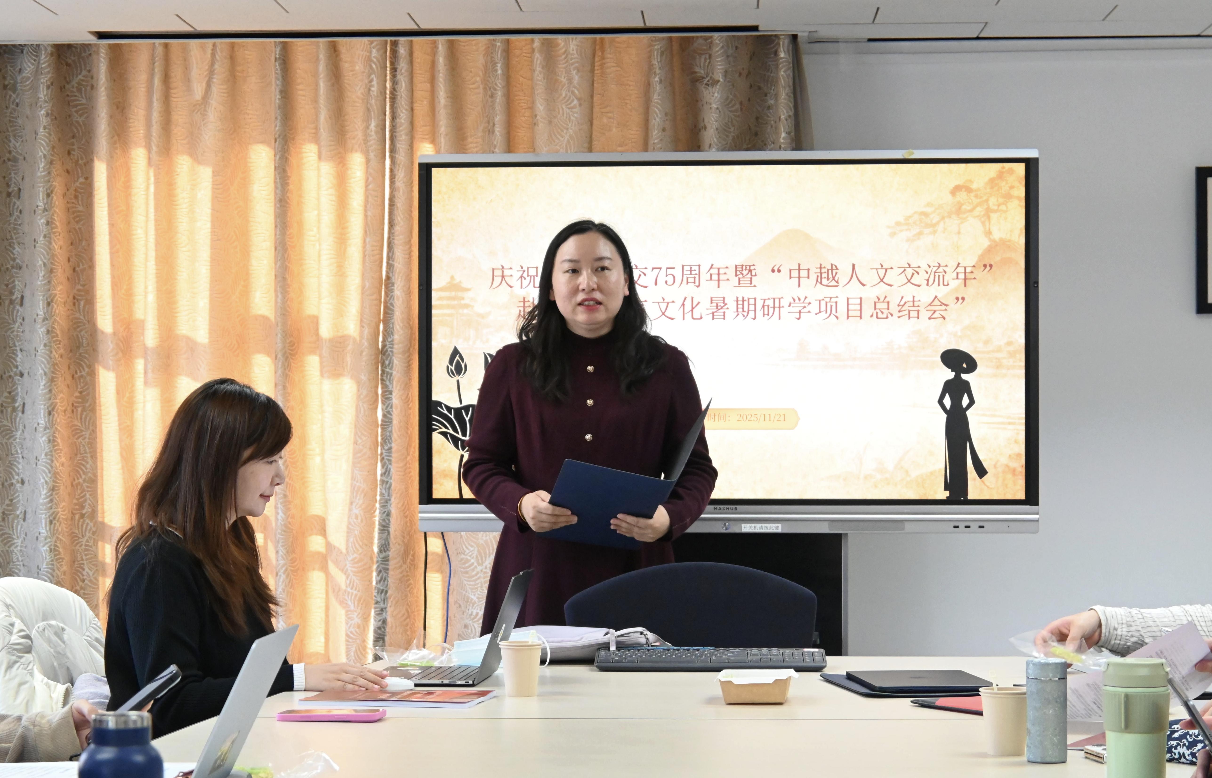 会议伊始,越南语教研室主任谢昂老师开场致辞。谢昂老师首先对此次暑期研学活动的圆满成功表示热烈祝贺。她对所有对此次活动给与大力支持的院系领导、各职能部门和教研室所有老师表达了最真挚的感谢。她指出,本次研学项目在中越建交75周年的特殊历史节点下,具有特别的意义,不仅是一次语言学习之旅,更是人文交流和青年外交的生动实践。谢昂老师高度肯定了同学们在项目过程中所展现出的团结协作精神和克服困难的坚定意志,为本次总结会拉开了序幕。