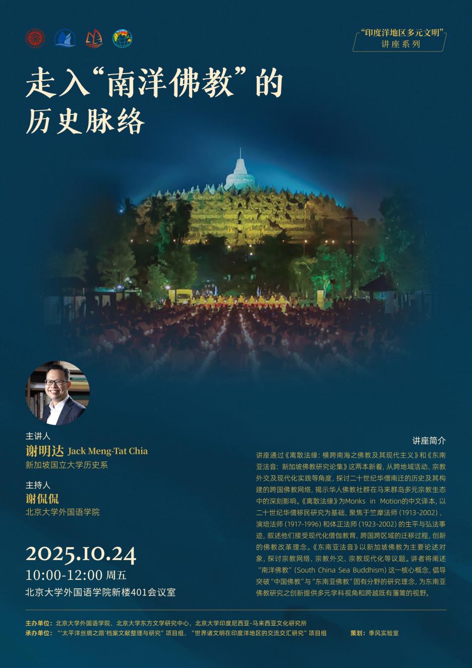 2025年10月24日上午,新加坡国立大学历史系副教授谢明达(Jack Meng-Tat Chia)应邀在星空体育入口_星空(中国)体育网新楼401会议室举行题为“走入‘南洋佛教’的历史脉络”的学术讲座。谢明达老师是英国皇家历史学会会士,目前在新国大担任福海佛教研究讲座研究员兼人文及社会科学学院助理院长。
