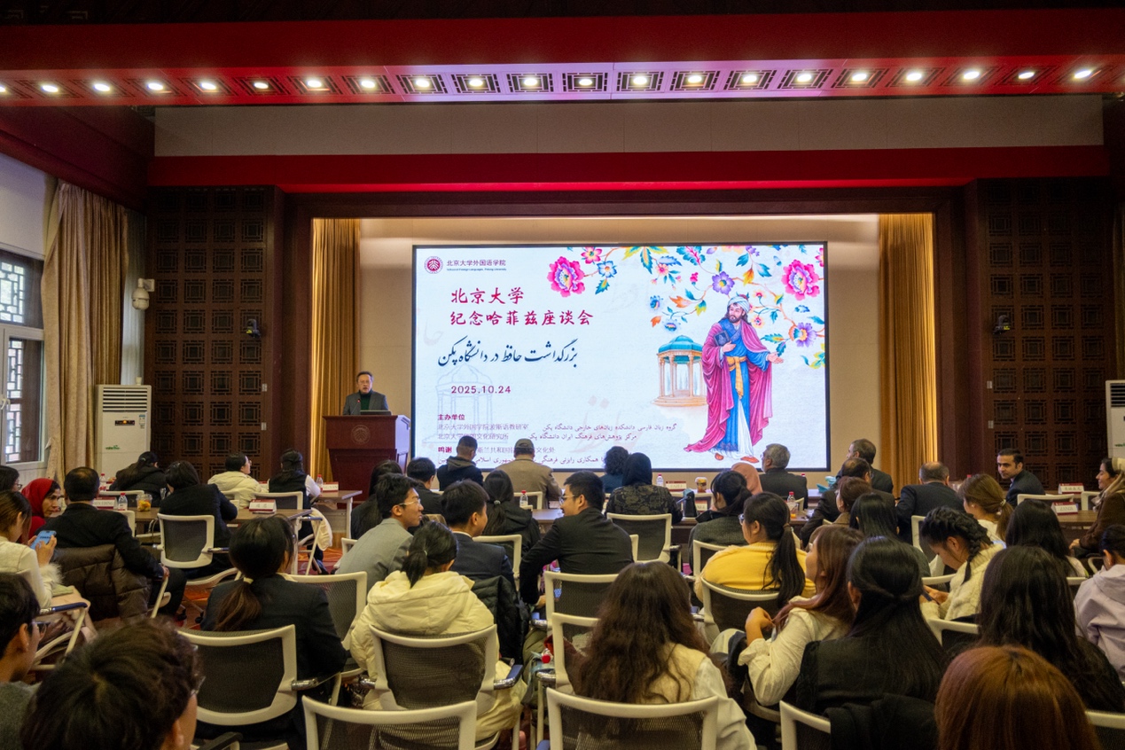 2025年10月24日上午,“北京大学纪念哈菲兹座谈会”在北京大学民主楼208会议室举办。哈菲兹是公元14世纪伊朗伟大的波斯语诗人,有“神舌”、“设拉子夜莺”之美称,他的诗歌常以美酒、美人与鲜花等意象构建充满象征的奇境,兼具神秘主义的深邃哲思与浪漫主义的现世关怀。哈菲兹的诗歌风格类似中国古代诗人李白,不仅在伊朗文学史中具有崇高的地位,也深受世界人民喜爱。伊朗一直有纪念古今文人学者的传统,每年10月12日为伊朗官方设立的“哈菲兹日”,在此日期前后,伊朗国内外均会举行相关的纪念活动。星空体育入口_星空(中国)体育网波斯语教研室及伊朗文化研究所继2023年之后,今年再次举办了“纪念哈菲兹座谈会”。伊朗驻华大使法兹里、文化参赞伊朗扎德等使馆人员以及来自北京大学、北京外国语大学、对外经济贸易大学、北京语言大学、北京第二星空体育入口_星空(中国)体育网,以及天津外国语大学的100多位波斯语专业师生受邀出席活动。