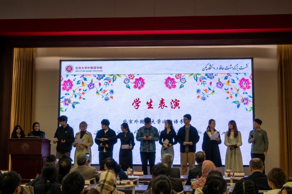 在场各高校波斯语专业的学生代表也为座谈会送上了精彩纷呈的节目,展现了各校波斯语专业的风采。北京大学波斯语专业的学生梳理了哈菲兹的生平,并通过朗诵的形式展现了哈菲兹的诗歌之优美、意蕴之丰富。其他高校的学生们也通过朗诵、演唱、舞蹈及话剧等形式表达了对诗人哈菲兹的缅怀之情。
