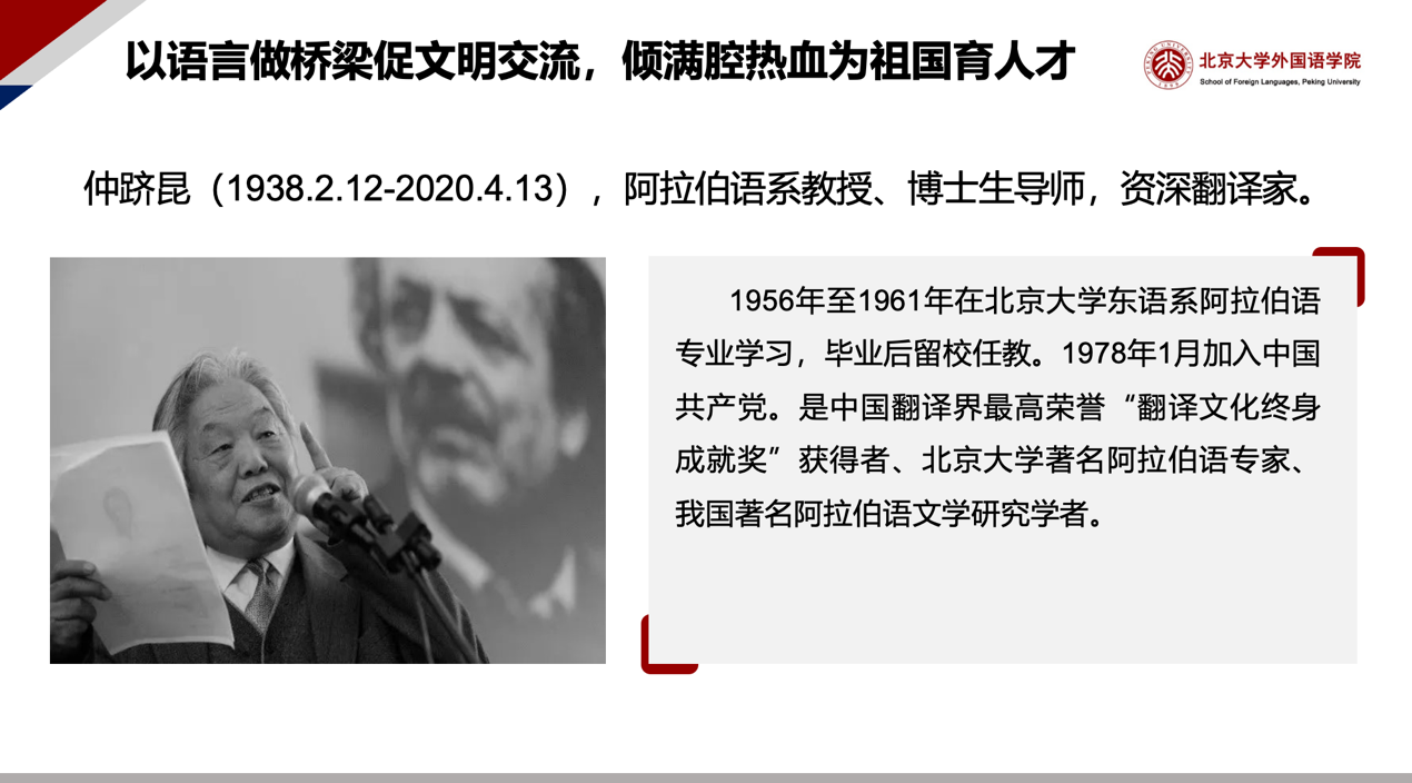 仲跻昆教授作为阿拉伯语界的泰斗,将一生奉献给中阿文化交流与翻译事业。在他看来,“人类文化的发展史就是一部翻译史”,而阿拉伯文学更是一块待雕琢的璞玉。他深耕教学与学术,提出“从广博到精深”的治学路径,鼓励学生超越老师、勇攀高峰。作为一名党员,他始终怀揣赤子之心,将个人事业与国家需要紧密相连。