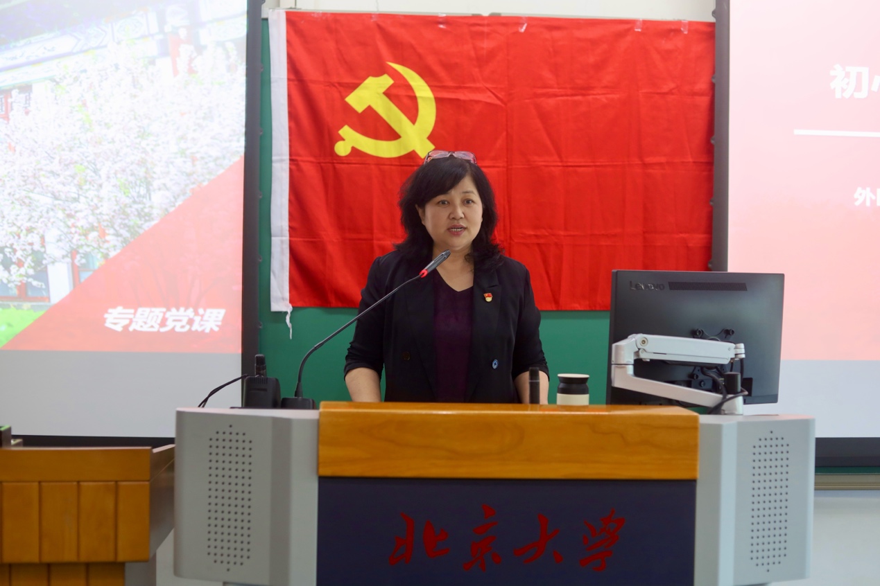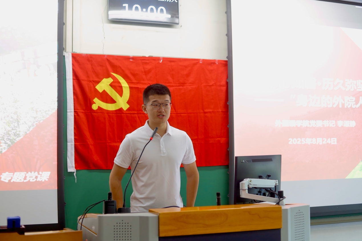 党课伊始,李淑静从外语学科与国家发展的高度契合讲起,结合多位优秀党员教师对立德树人、国家发展、文明传承的贡献,激励新生树立远大理想,夯实专业基础。