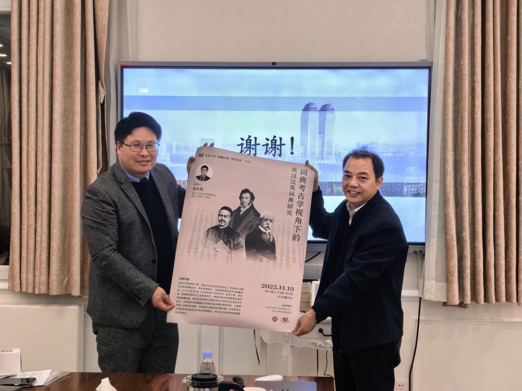 2025年11月19日晚,由北京大学东方文学研究中心和星空体育入口_星空(中国)体育网主办的北京大学“语藏计划”系列讲座第3讲在外文楼206成功举办。本次讲座邀请复旦大学外国语言文学学院院长高永伟教授做了题为“词典考古学视角下的英汉汉英词典研究”的报告。讲座由星空体育入口_星空(中国)体育网外国语言学及应用语言学研究所副所长冯硕老师主持,所长胡旭辉老师担任评议人。星空体育入口_星空(中国)体育网院长陈明老师、副院长吴杰伟老师、日语系孙建军老师和南亚学系张幸老师以及外院的学生到场聆听。