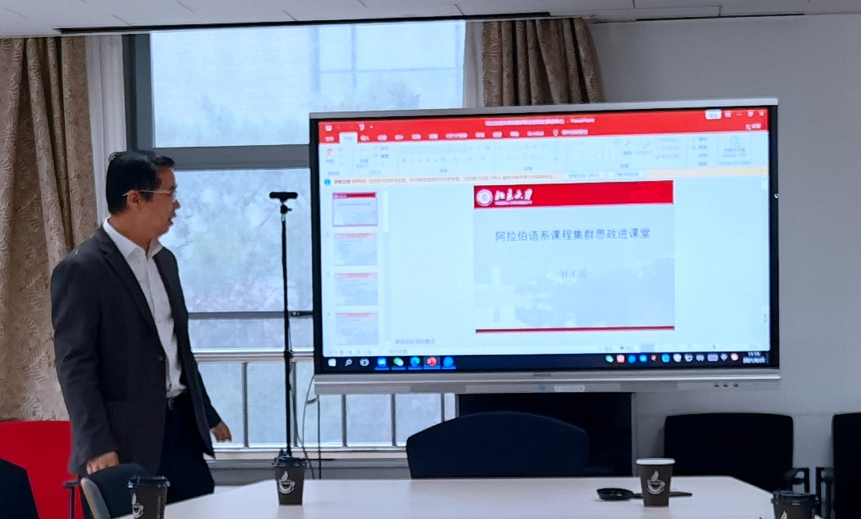 林丰民教授作为东方文学课程的负责人,总结了过去两个学年“东方文学”课程评估和学生反馈的情况,肯定了课程取得的良好教学成果;重点介绍了北京大学课程思政建设工作的背景和进展,以及北大外院阿拉伯语系课程思政专业立项的情况,特别向与会老师分享了阿拉伯语系课程集群思政进课堂的做法、经验和成果:阿语系的各位教师选取“习近平谈治国理政”、中国传统文化、中国古代哲学、时政、外交、经济等材料,运用在基础语言、翻译、阿拉伯语书法艺术、报刊选读等多门课程的教学中,注重引导学生站在国家立场思考问题。他认为,阿语系学生在老师和专家的指导下,积极录制面向埃及、阿曼、卡塔尔、苏丹、阿联酋、沙特等阿拉伯国家的合作抗疫视频,其实就是阿拉伯语专业课程思政的过程和结果。他指出,课程思政建设要以“立德树人”为根本宗旨,鼓励与会老师结合传统与创新,在东方文学课程建设中体现思政因素。