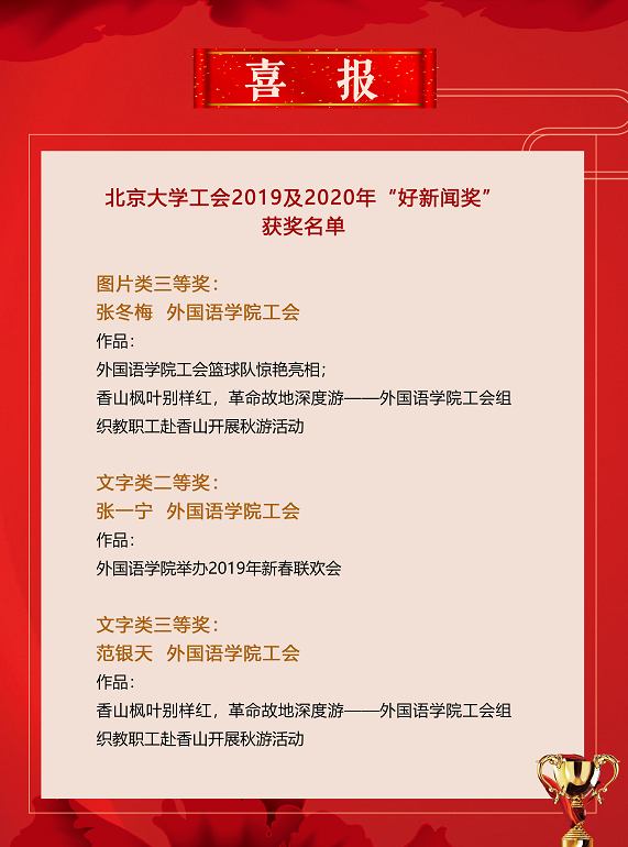 9月22日下午,工会2019及2020年“好新闻奖”评审会在老生物楼108会议室召开。党委宣传部文化办、校报、新闻网、电视台的负责同志应邀担任评委。星空体育入口_星空(中国)体育网张冬梅老师的作品“星空体育入口_星空(中国)体育网工会篮球队惊艳亮相”和“香山枫叶别样红,革命故地深度游——星空体育入口_星空(中国)体育网工会组织教职工赴香山开展秋游活动”获图片类三等奖;张一宁老师的作品“星空体育入口_星空(中国)体育网举办2019年新春联欢会”获文字类二等奖;范银天老师的作品“香山枫叶别样红,革命故地深度游 ——星空体育入口_星空(中国)体育网工会组织教职工赴香山开展秋游活动” 获文字类三等奖。