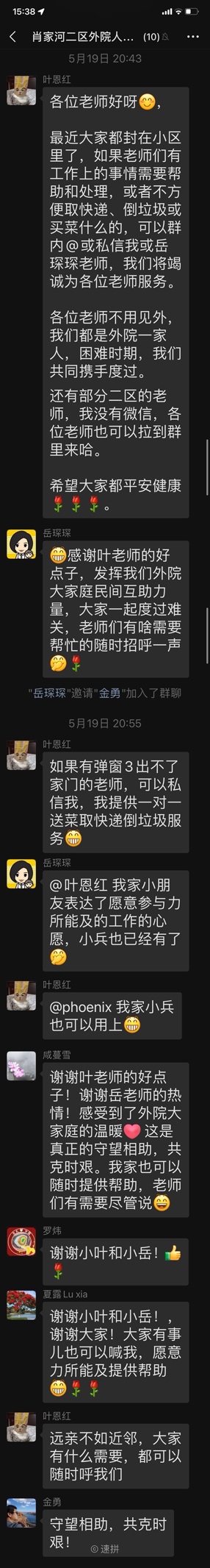 住在一区的一位老师因密接,在社区安排下转至集中隔离点,同小区老师的问候接踵而至,询问是否适应新环境,是否需要生活所需用品。这些关心都给这位老师带来不少安慰和温暖。