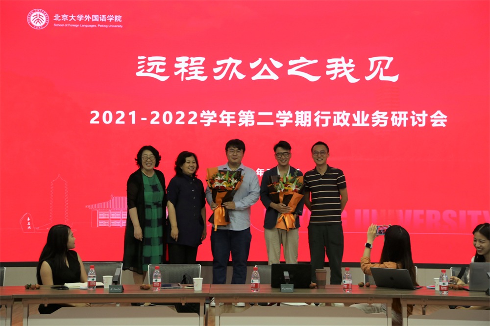 本学期末,学生工作办公室的王乃懋老师与王志峰老师将离任,熊珊儿、杜姝格作为2022届选留生加入到了外院行政大家庭,党委书记李淑静老师、副院长张冬梅老师分别为离任老师献上鲜花,祝福他们前程似锦。学院为新同事准备了迎新礼物,欢迎两位老师的加入。