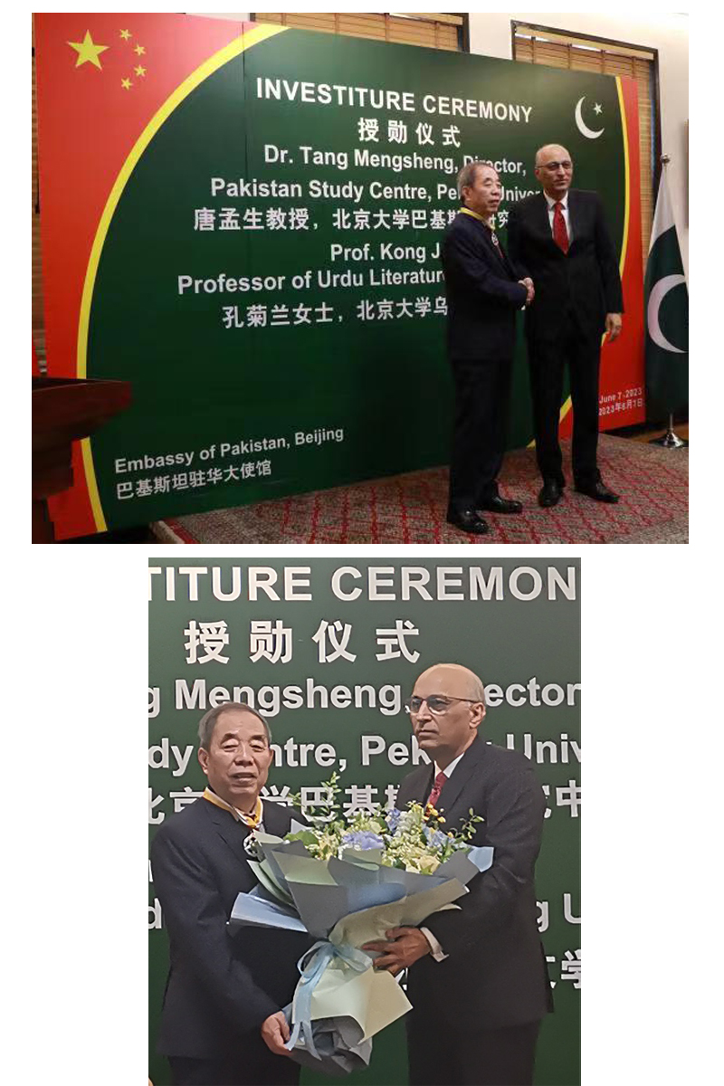 2023年6月7日,巴基斯坦驻华大使馆举办隆重仪式,授予星空体育入口_星空(中国)体育网南亚学系唐孟生教授与孔菊兰教授巴基斯坦“卓越之星”勋章,以表彰两位学者在推动乌尔都语教学、增进两国人文交流、增进中巴友谊方面作出的重要贡献。巴基斯坦驻华大使莫因·哈克、政务参赞穆罕默德·卢曼·艾哈迈德、武官Ranna Faisal Rafiq准将、社会福利公使Ijaz Ahmad、科技公使Kamran Rasheed博士,以及原中国驻(巴基斯坦)卡拉奇总领事安启光、三峡集团财务总监王少峰等各界人士出席了授勋仪式。
