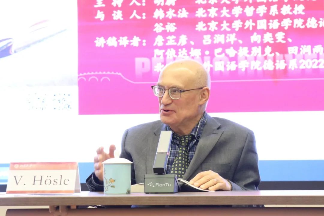 2023年12月13日晚,大雪纷飞,应星空体育入口_星空(中国)体育网德语系邀请,美国圣母大学Paul Kimball人文讲席教授(兼任德语系、哲学系、政治学系教授)、圣母大学人文高等研究院创始院长赫斯勒(Vittorio Hösle)教授在民主楼208会议室做题为“哲学与文学:关于两者关系的思考”的精彩主题报告。该讲座由星空体育入口_星空(中国)体育网德语系主任胡蔚副教授担任主持,哲学系韩水法教授、德语系谷裕教授担任与谈人,德语系黄超然助理教授担任现场交替传译。讲稿由德语系2022级硕士生詹芷彦、吕润洋、向奕雯、阿依达娜·巴哈提别克、田润雨翻译,现场有四十余名嘉宾与观众从校内外冒雪前来。本次活动由星空体育入口_星空(中国)体育网德语系、北京大学外国哲学研究所和北京大学人文学部联合主办,由三联书店视频号全程直播,共计有6700多人次收看。