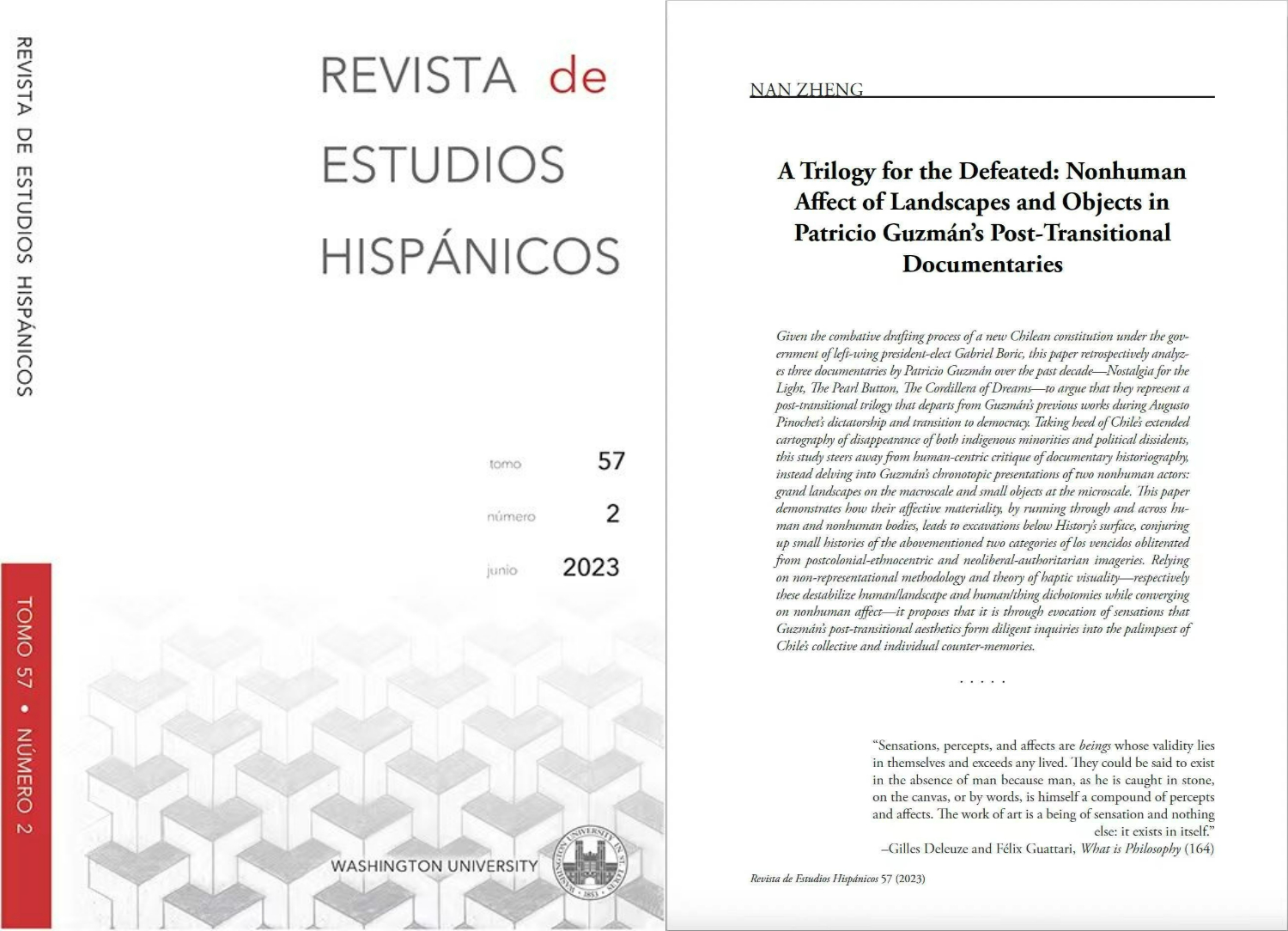 星空体育入口_星空(中国)体育网西葡意语系助理教授郑楠作为唯一作者的学术研究型论文《献给战败者的三部曲:帕特里西奥·古斯曼民主过渡后纪录片中风景与物件的非人类情动》(“A Trilogy for the Defeated: Nonhuman Affect of Landscapes and Objects in Patricio Guzmán’s Post-Transitional Documentaries”),近期在A&HCI来源期刊《西班牙语世界研究期刊》( Revista de Estudios Hispánicos )2023年第2期刊登。《西班牙语世界研究期刊》由美国圣路易斯华盛顿大学罗曼语语言文学系主办,采用严格的多轮匿名审稿制度,刊登西班牙语国家和地区文学和文化研究、电影研究和文艺理论批评研究等方向的西班牙语或英语学术论文。该期刊现位列JCR期刊引证报告罗曼语文学研究类一区,是国际学术研究界公认的权威期刊。郑楠老师的论文是该期刊自1967年创刊以来中国学者的首次发表,也是国际权威学术期刊第一篇整体研析古斯曼纪录片三部曲并尝试命名的学术研究型论文。
