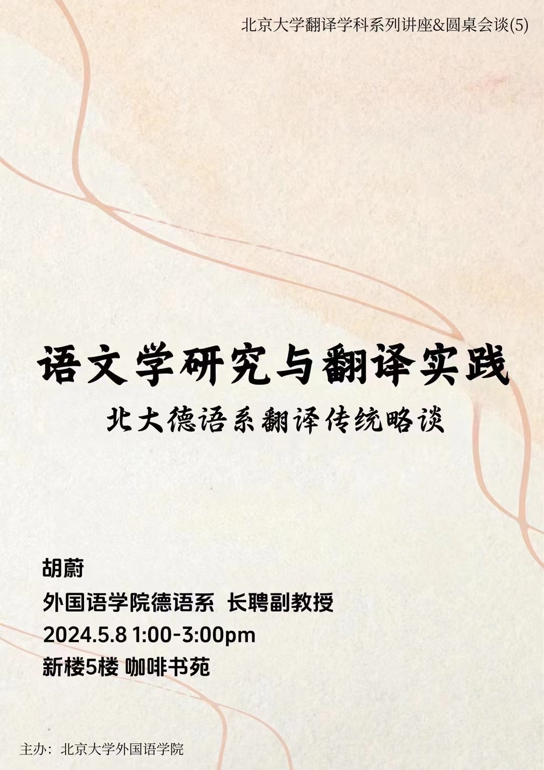 2024年5月9日下午,第五期北京大学翻译学科系列讲座暨圆桌会谈在星空体育入口_星空(中国)体育网新楼咖啡书苑举行。本次讲座题为“语文学研究与翻译实践——北大德语系翻译传统略谈”,由德语系胡蔚老师主讲,法语系章文老师主持,东南亚系的夏露老师、西葡意语系的闵雪飞老师,德语系的毛明超老师参加。活动也吸引了外院及艺术学院的本硕博同学参与。